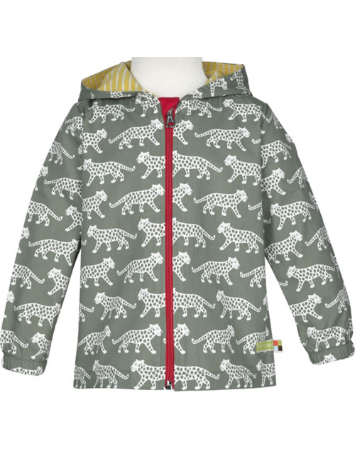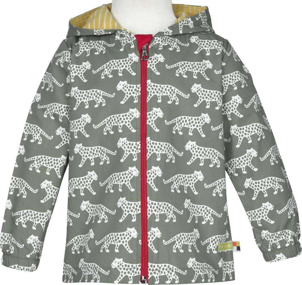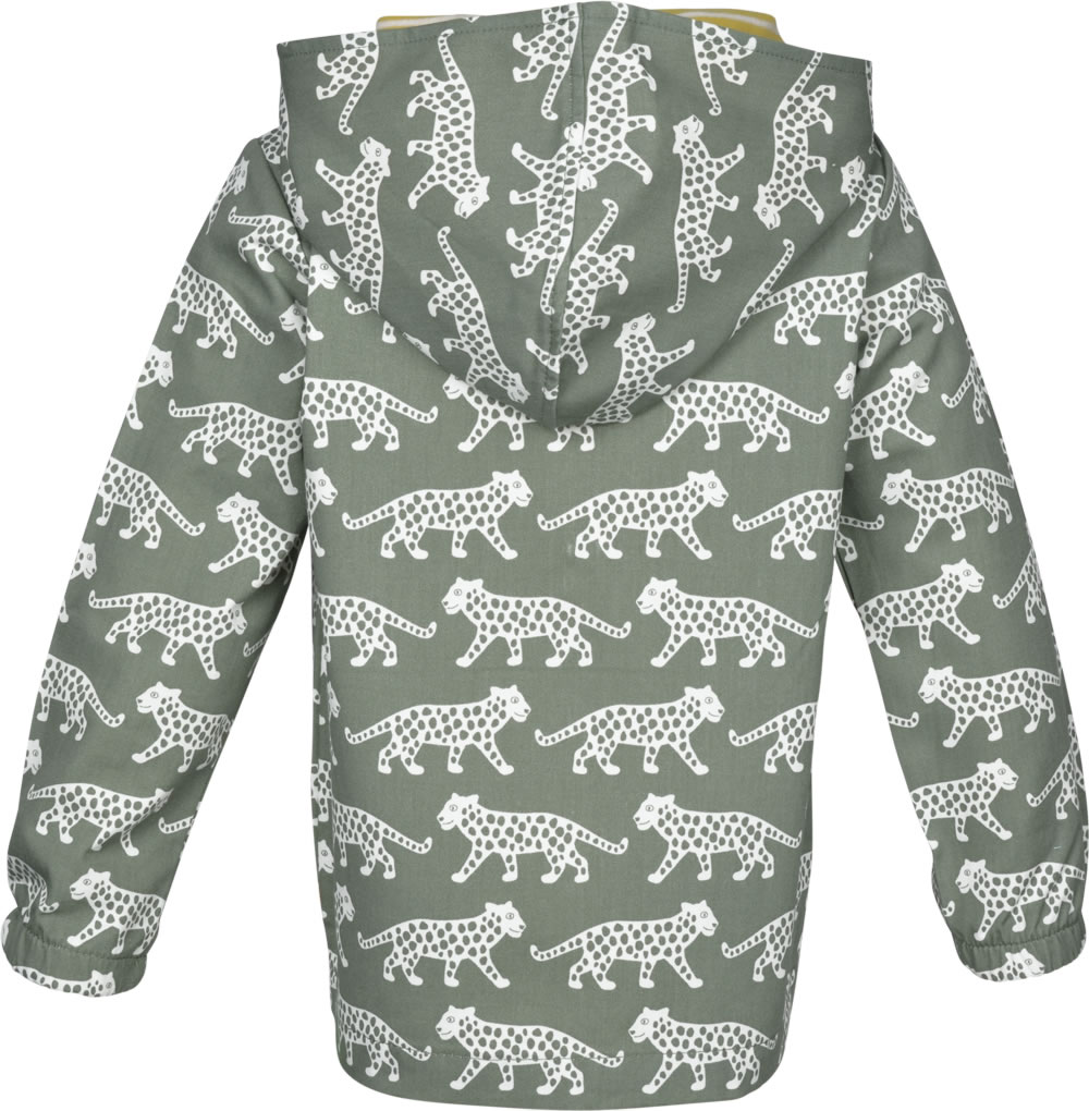 Tolle Outdoor-Jacke aus 100 % organischer Baumwolle von LOUD + PROUD. Das Geparden-Muster macht diese Jacke zu einem echten Blickfang. Die Kapuze ist mit gelb und weiß gestreiftem Jersey gefüttert.