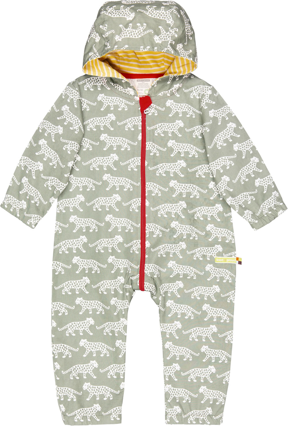 Outdoor-Overall aus 100 % organischer Baumwolle von LOUD + PROUD mit Allover-Druck. Das typisch freche Muster und die tolle Farbe machen diesen Overall zu einem echten Blickfang. Die atmungsaktive BIONIC-FINISH ECO-Imprägnierung ist fluorfrei und macht ihn wasser- und schmutzabweisend. Er ist besonders leicht und das Material sorgt für einen hohen Tragekomfort. Die Kapuze ist mit einem weichen Baumwoll-Stoff in orangerot-petrol gestreift gefüttert und die Ärmel sind mit einem Gummibündchen ausgestattet. Ein toller Kontrast ist der farblich abgesetzte Reißverschluss.