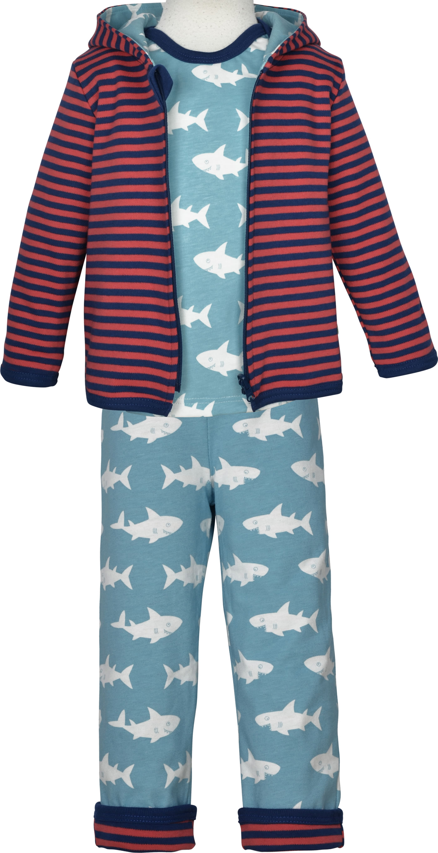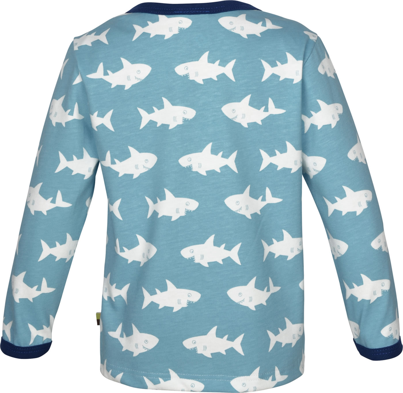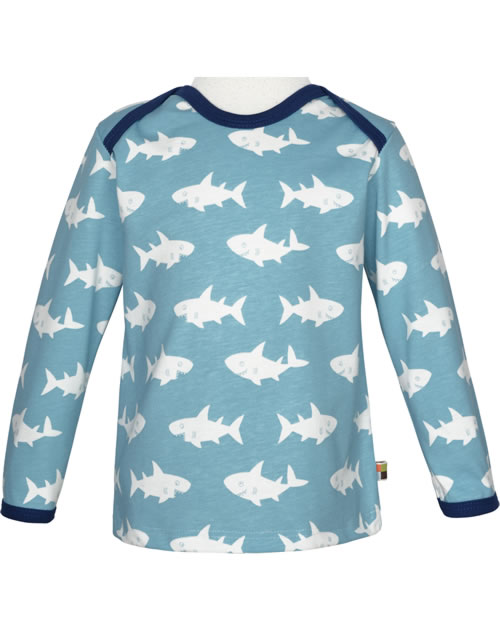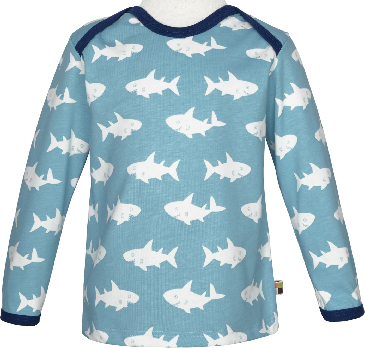 Tolles Langarmshirt von LOUD + PROUD aus angenehm weicher Baumwolle. Die Armbündchen und der Kragen schließen mit Kontrastpaspeln ab. Ein Hingucker der Allover-Print mit Haien. Bis Größe 86/92 mit Wickelkragen. Mit Logo-Fähnchen an der Seitennaht.