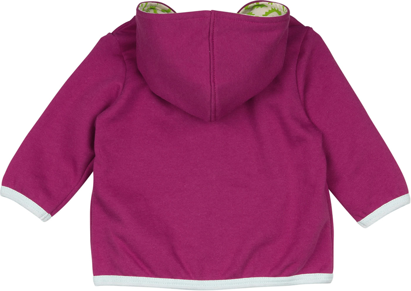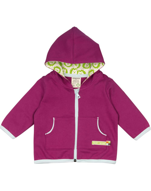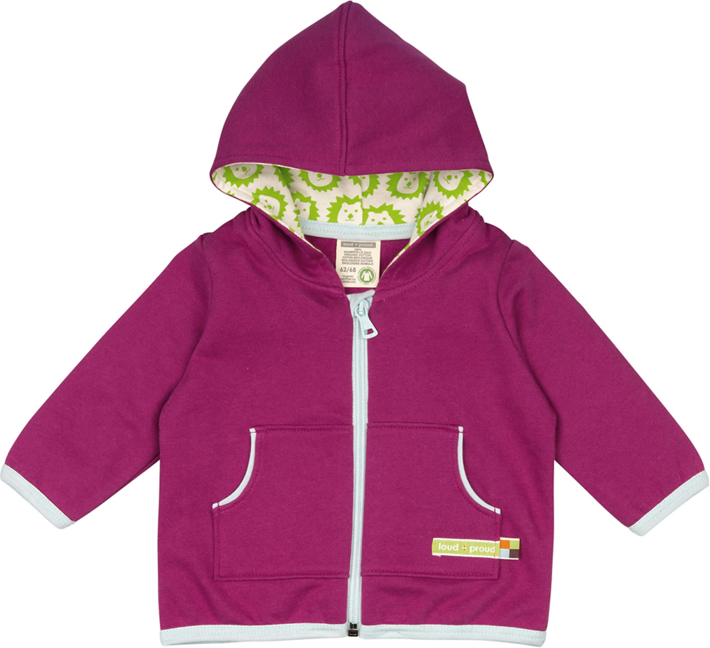Schöne Sweat-Jacke von LOUD + PROUD in fuchsia. Die Kapuze ist innen mit einem Löwen-Alloverdruck aus Jersey abgefüttert. Der Reißverschluss in der Kontrastfarbe hellblau ist ein toller Blickfang. Außerdem ist die aufgesetzte Känguruh-Tasche mit kontrastfarbenen Paspeln ein schönes Detail. Mit Logo-Fähnchen an der Tasche.