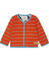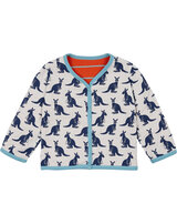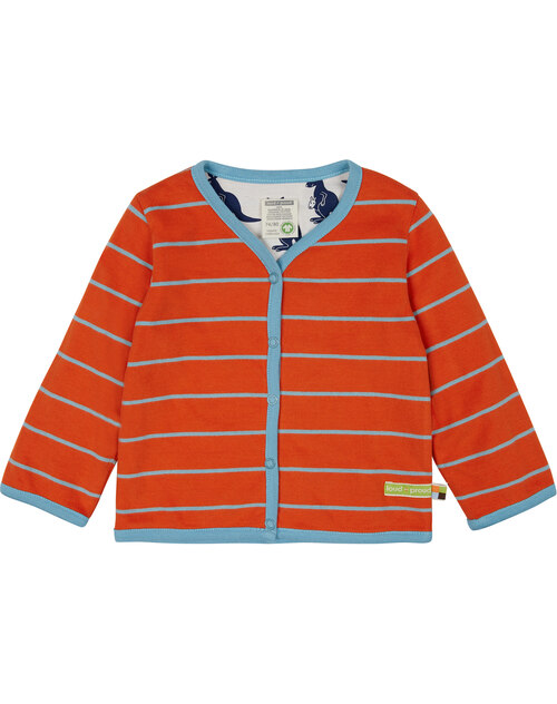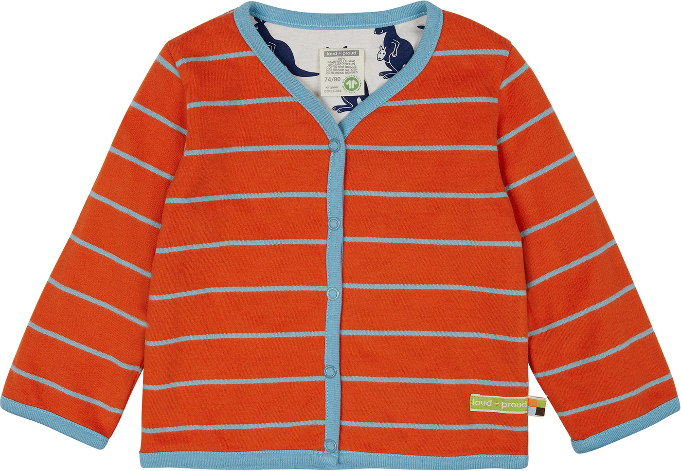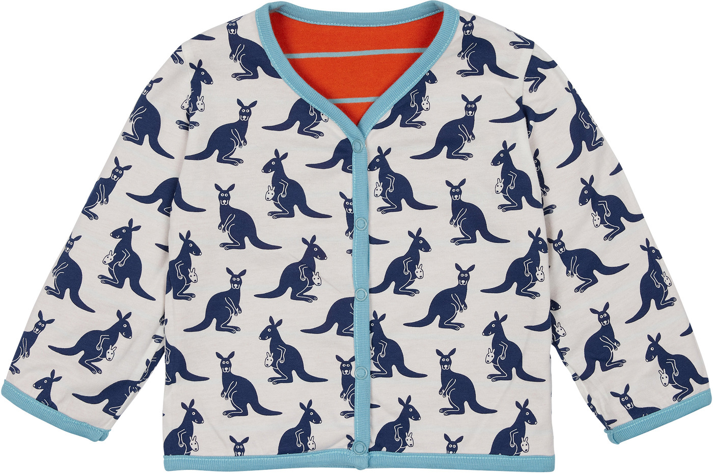 Schöne Sweat-Jacke zum Wenden von LOUD + PROUD. Die doppellagige Jacke kann je nach Lust und Laune mit der geringelten Seite oder der Seite mit den lustigen Kängurus getragen werden. Verschlossen wird die Jacke mit Druckknöpfen.