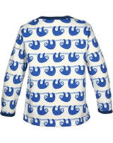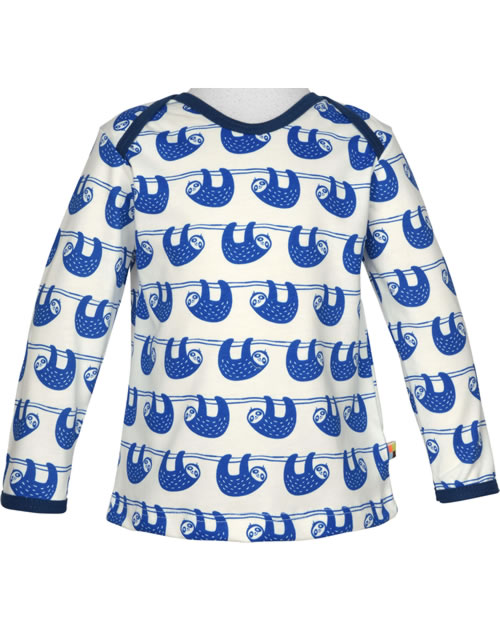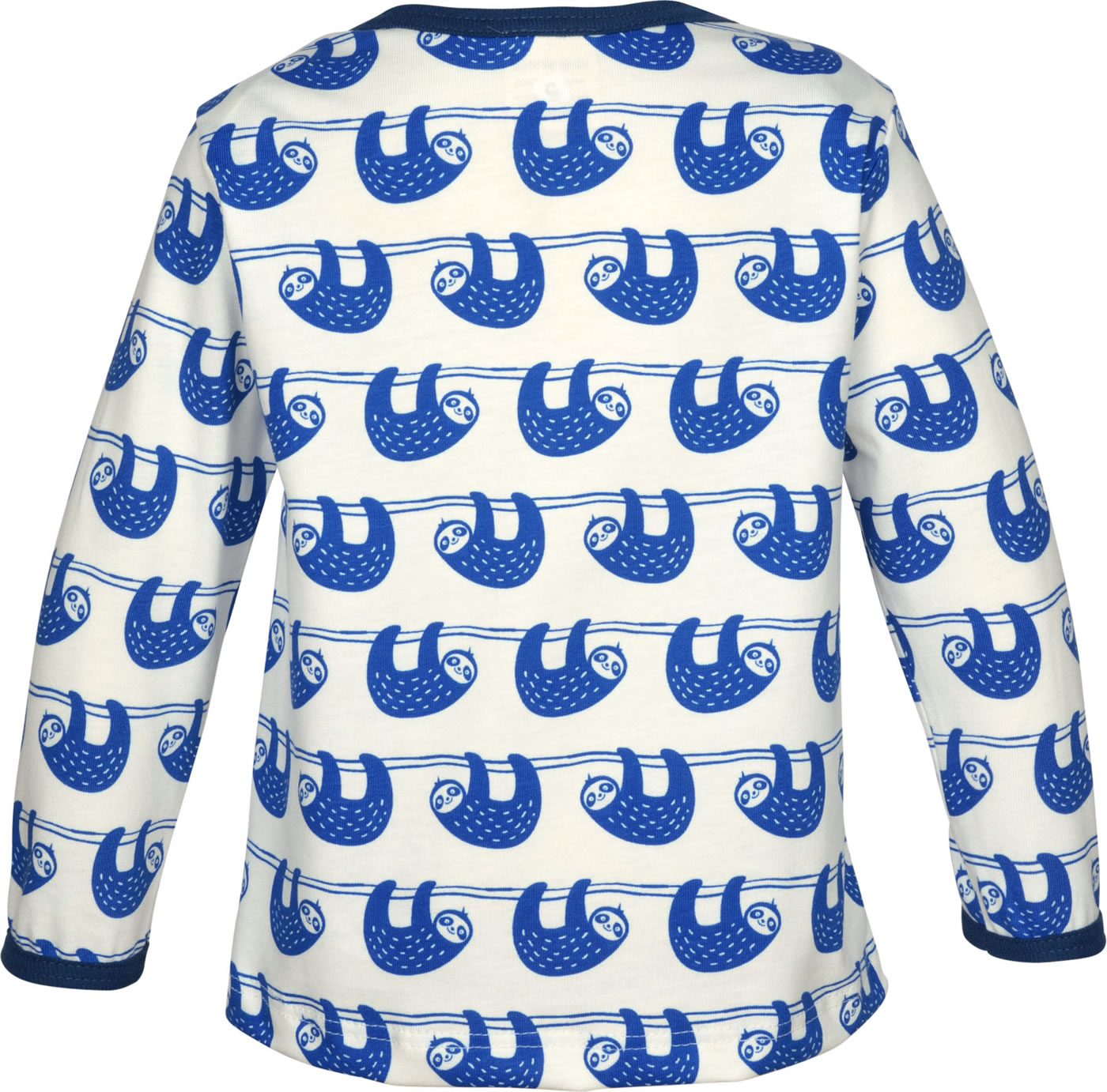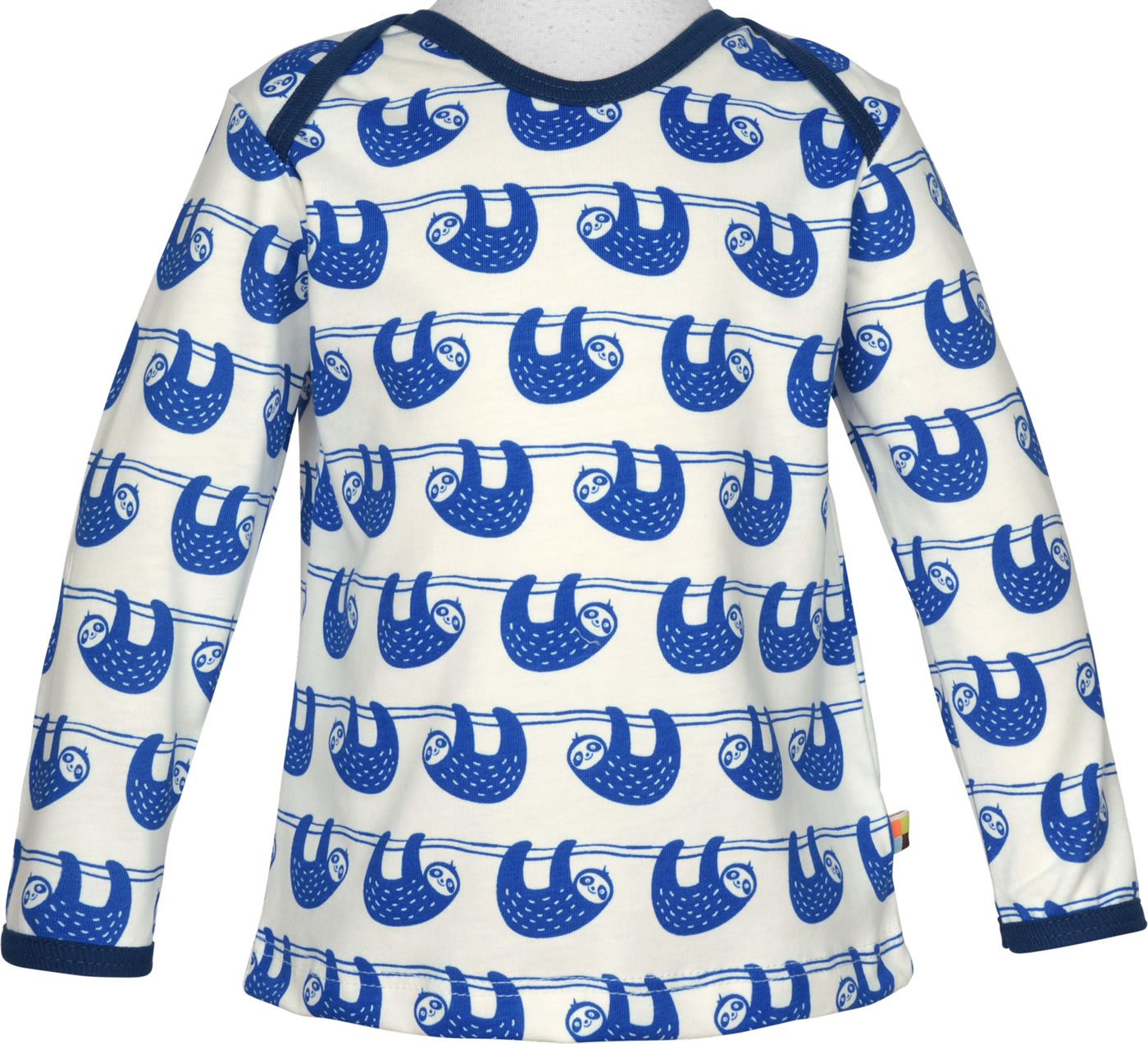Farbenfrohes Langarm-Shirt von LOUD+PROUD aus weichem Single Jersey mit ganzflächig aufgedruckten Faultieren in cobalt. Der Druck ist auf Wasserbasis gearbeitet und die Bündchen sind mit Feinripp in der Kontrastfarbe dunkelblau eingefasst. Bis Größe 86/92 weit zu öffnender Halsausschnitt, ab Größe 98/104 Rundhals-Ausschnitt. Mit Logo-Fähnchen an der Seitennaht.