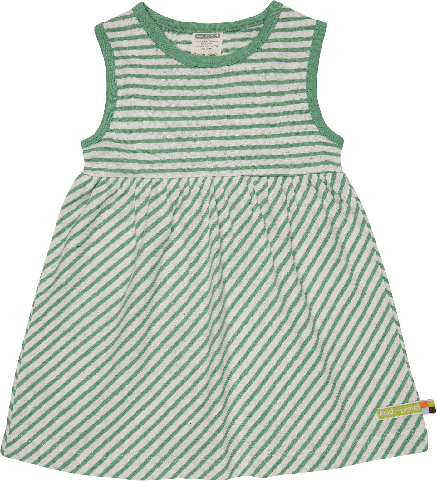 Hübsches gestreiftes Trägerkleid von LOUD + PROUD mit farbigen Paspeln. Das Kleid ist in leichter A-Linie geschnitten. Es lässt sich toll kombinieren: ob mit Strumpfhose oder solo getragen an warmen Tagen. Der Leinenanteil hat einen kühlenden Effekt. Im unteren Bereich ist das Kleid diagonal gestreift.