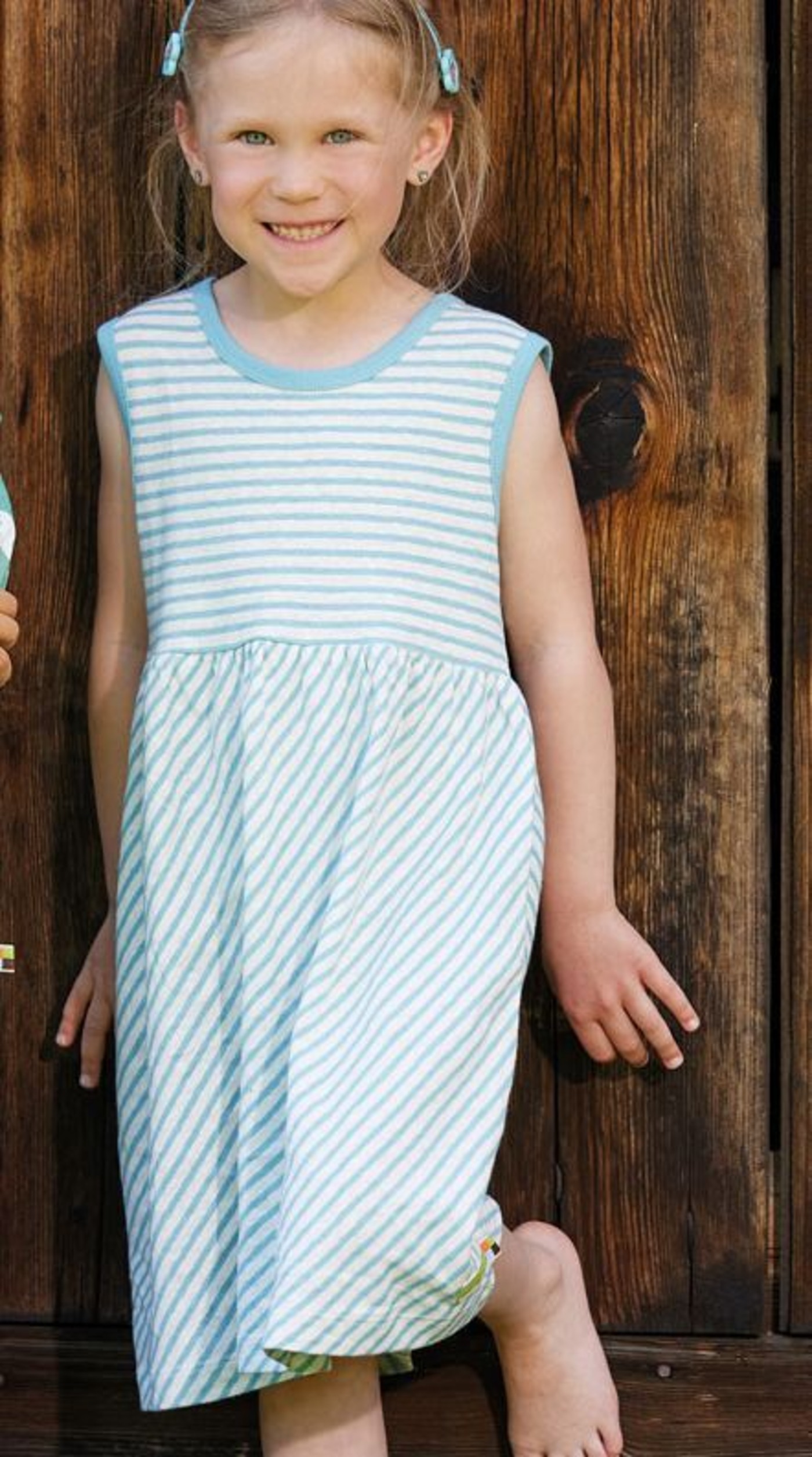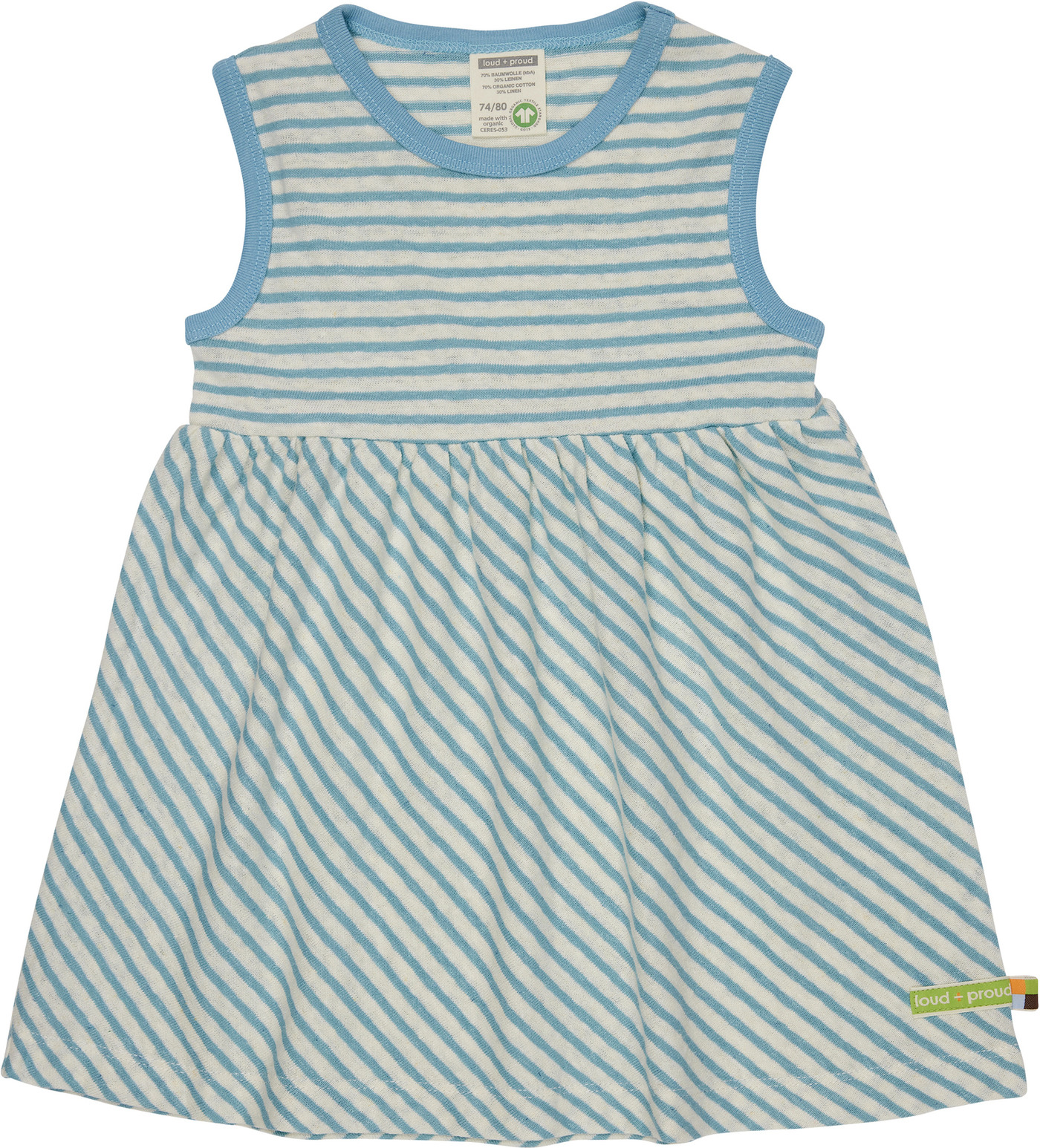 Hübsches gestreiftes Trägerkleid von LOUD + PROUD mit farbigen Paspeln. Das Kleid ist in leichter A-Linie geschnitten. Es lässt sich toll kombinieren: ob mit Strumpfhose oder solo getragen an warmen Tagen. Der Leinenanteil hat einen kühlenden Effekt. Im unteren Bereich ist das Kleid diagonal gestreift.