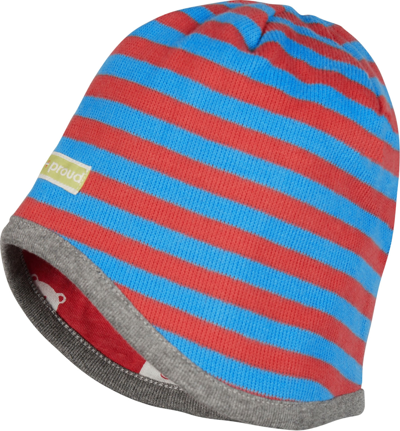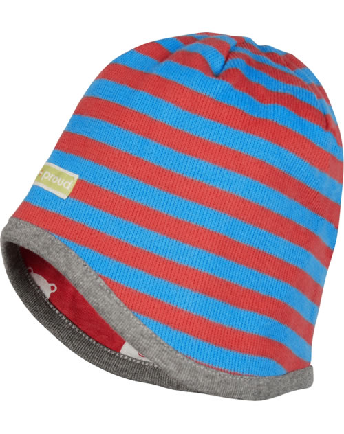Farbenfrohe Wende-Mütze von LOUD + PROUD. Ob die Seite mit dem Ringel oder die Seite mit dem Allover-Druck – die Mütze lässt sich nach Lust und Laune kombinieren.