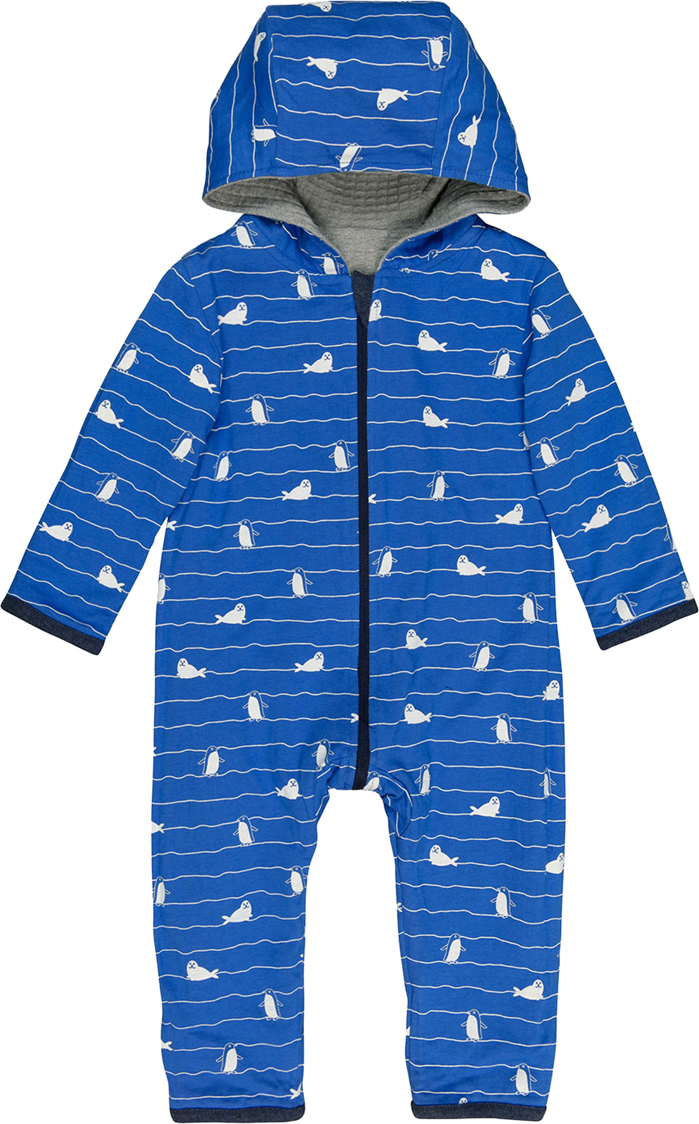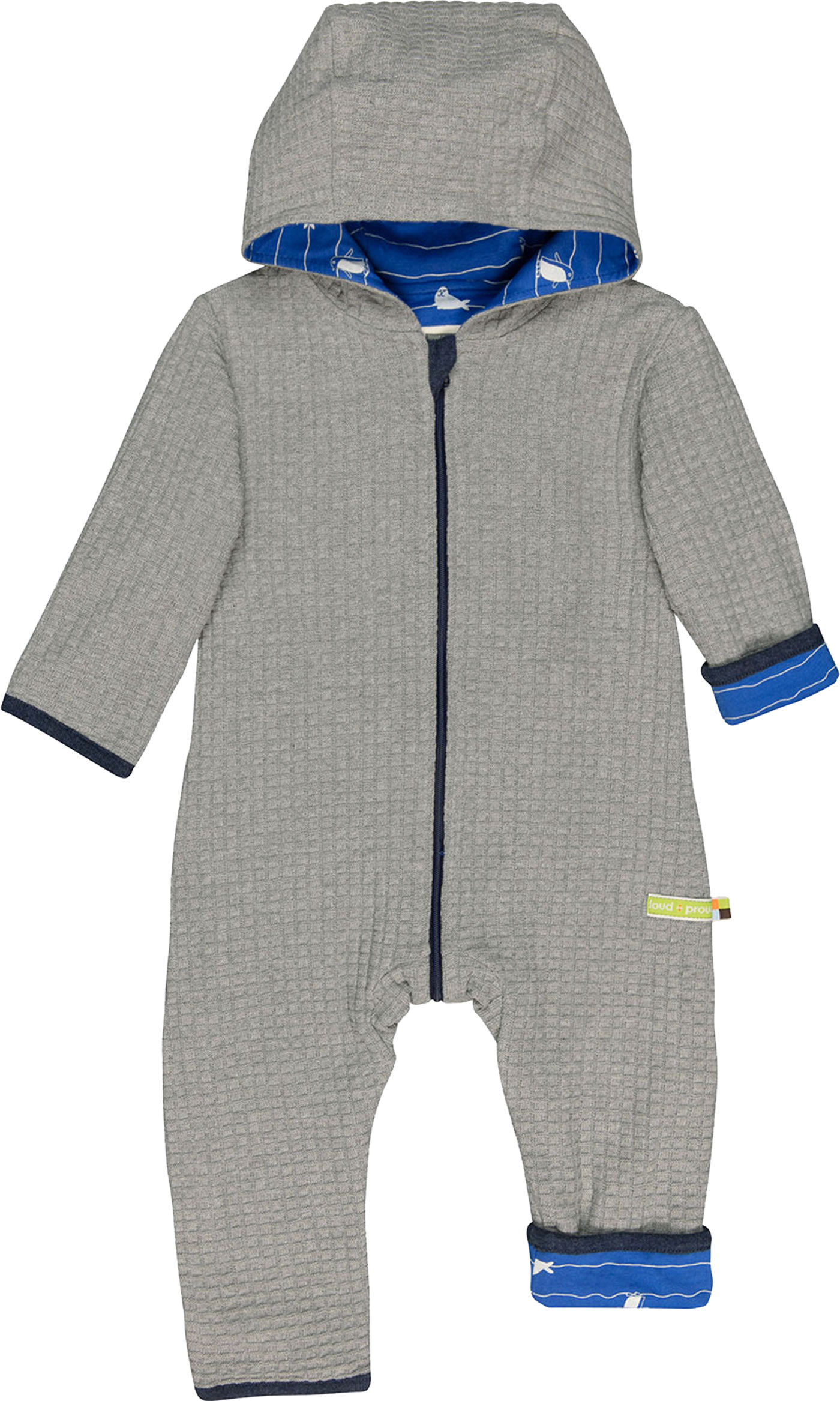 Wende-Overall in Waffelstrick-Optik von LOUD + PROUD. Die Strickseite ist unifarbend, die andere Jersey-Seite ist mit weichem Robben und Pinguin-Alloverprint. Auf der Vorderseite befindet sich ein Reißverschluss bis zum Schritt, der das An- und Ausziehen erleichtert. Die Bündchen sind in einer Kontrastfarbe gearbeitet. Der Overall ist ein ideales Kleidungsstück für die Babyschale oder den Kinderwagen.