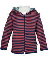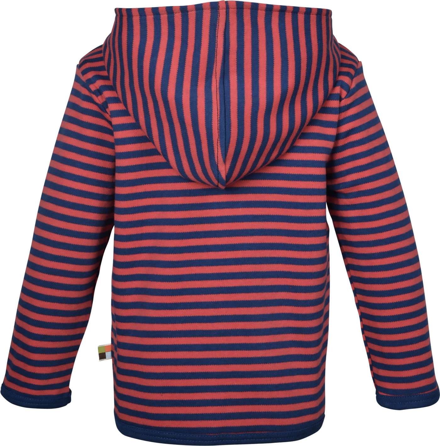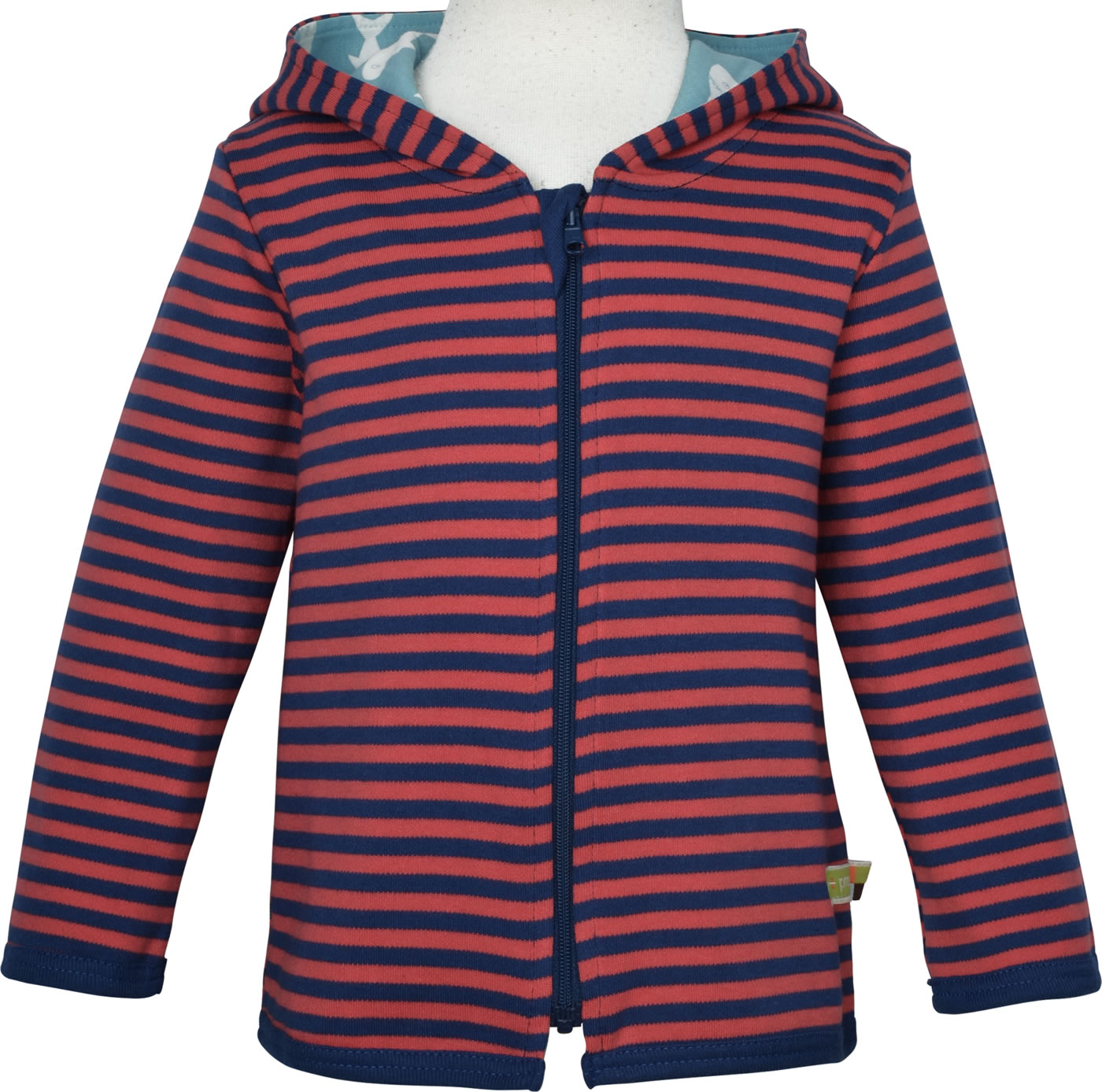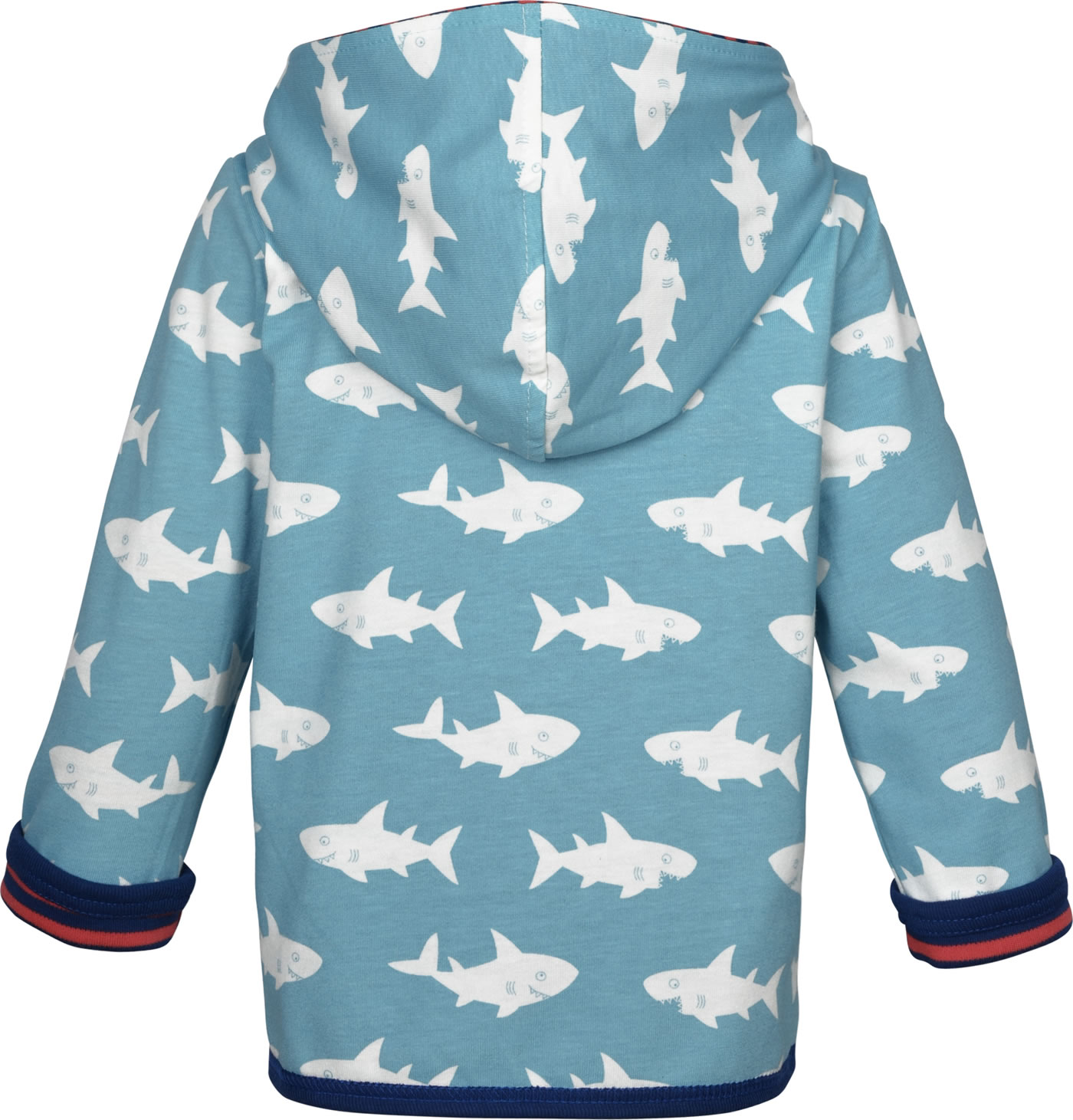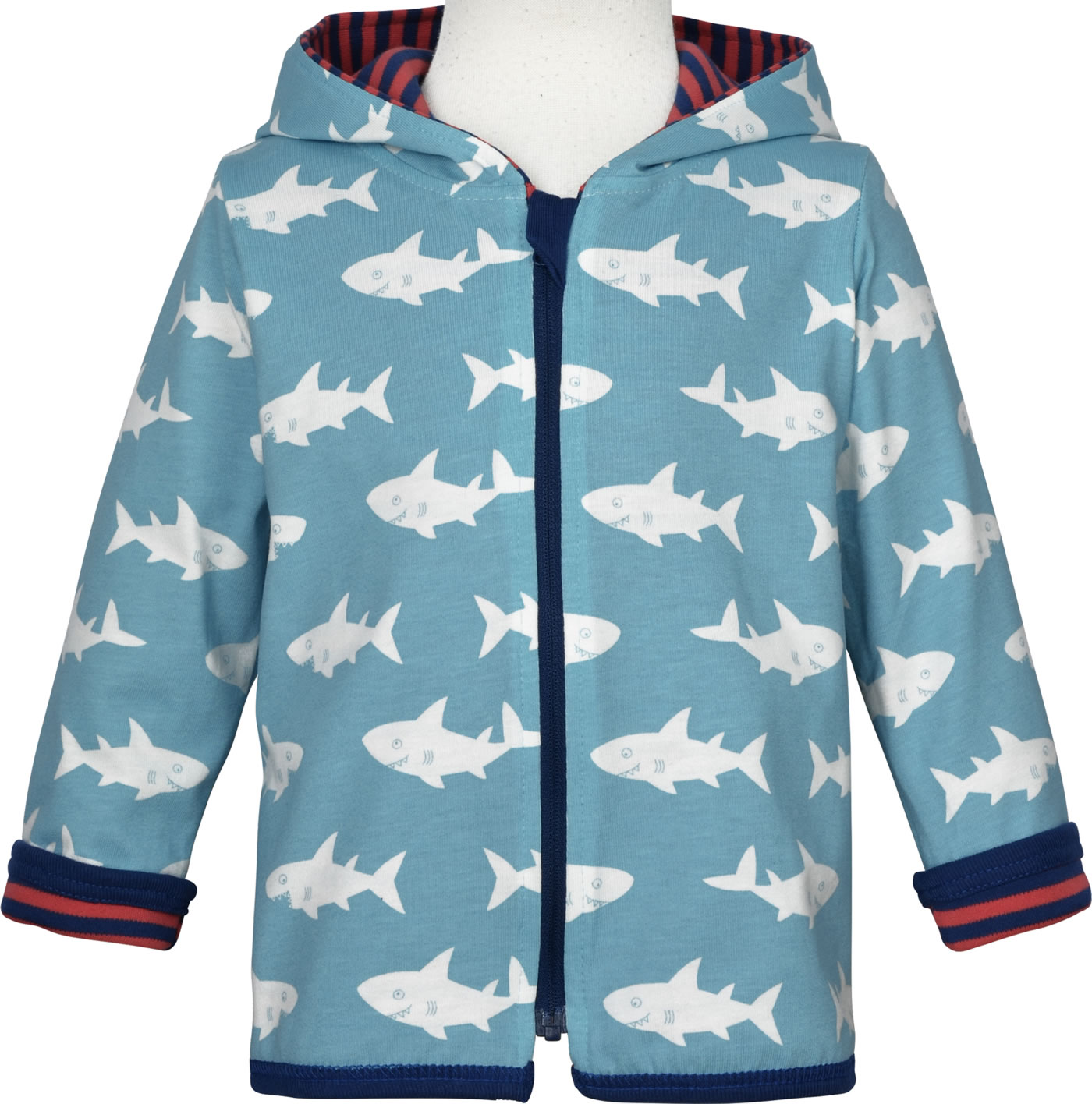 Weiche Sweatjacke zum Wenden mit Kapuze von LOUD + PROUD. Die mit Haien bedruckte Seite ist aus Jersey und die gringelte Seite aus Interlock gefertigt. Verschlossen wir die Jacke mit einem Reißverschluss. Diese Jacke ist ein perfekter Begleiter für kühlere Tage.
