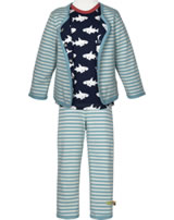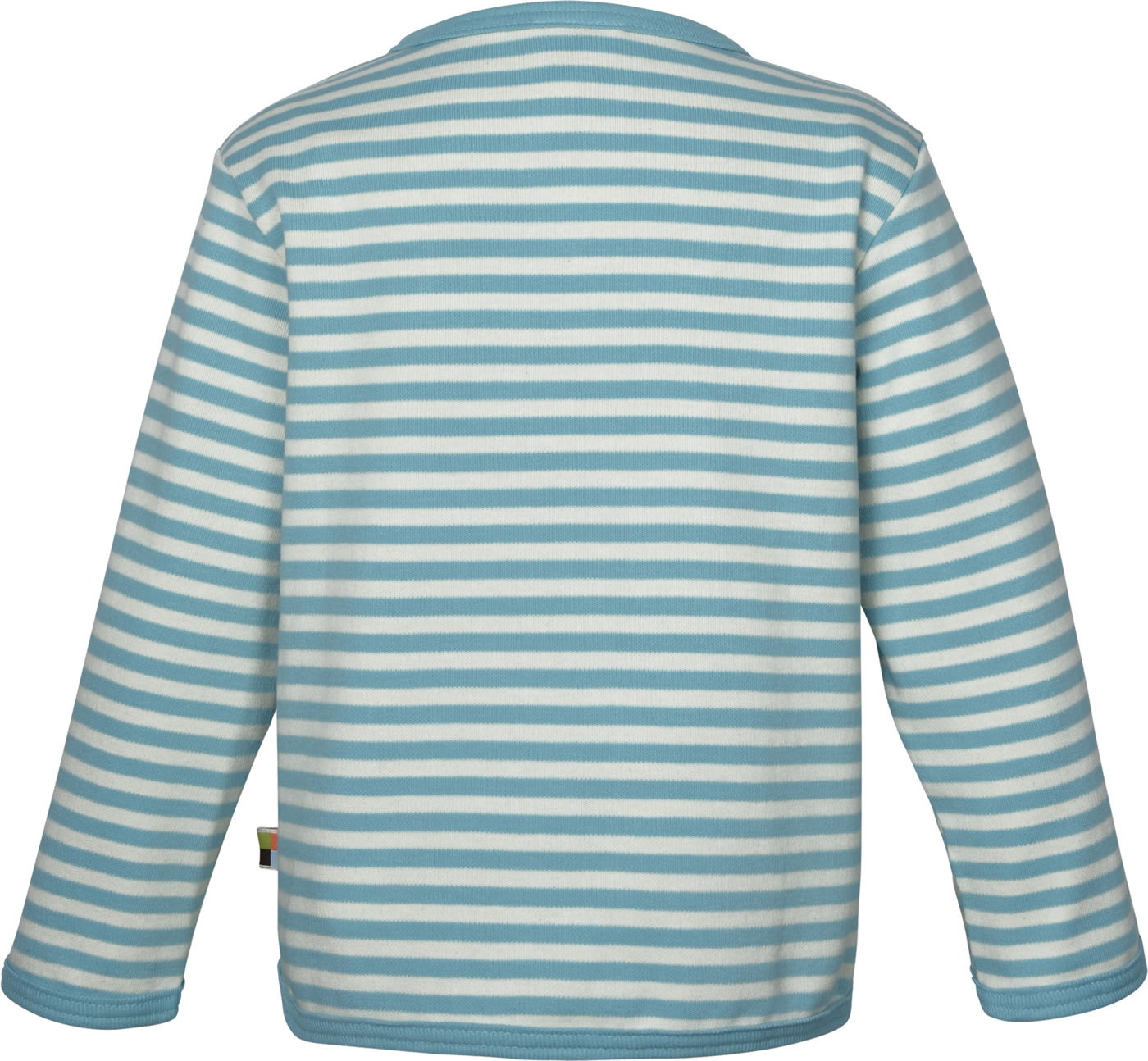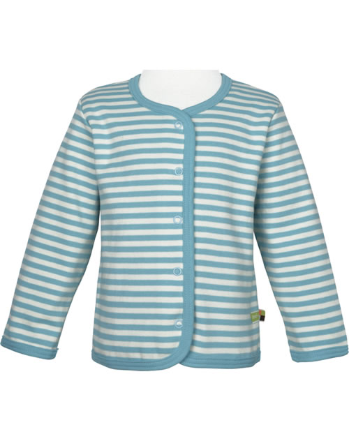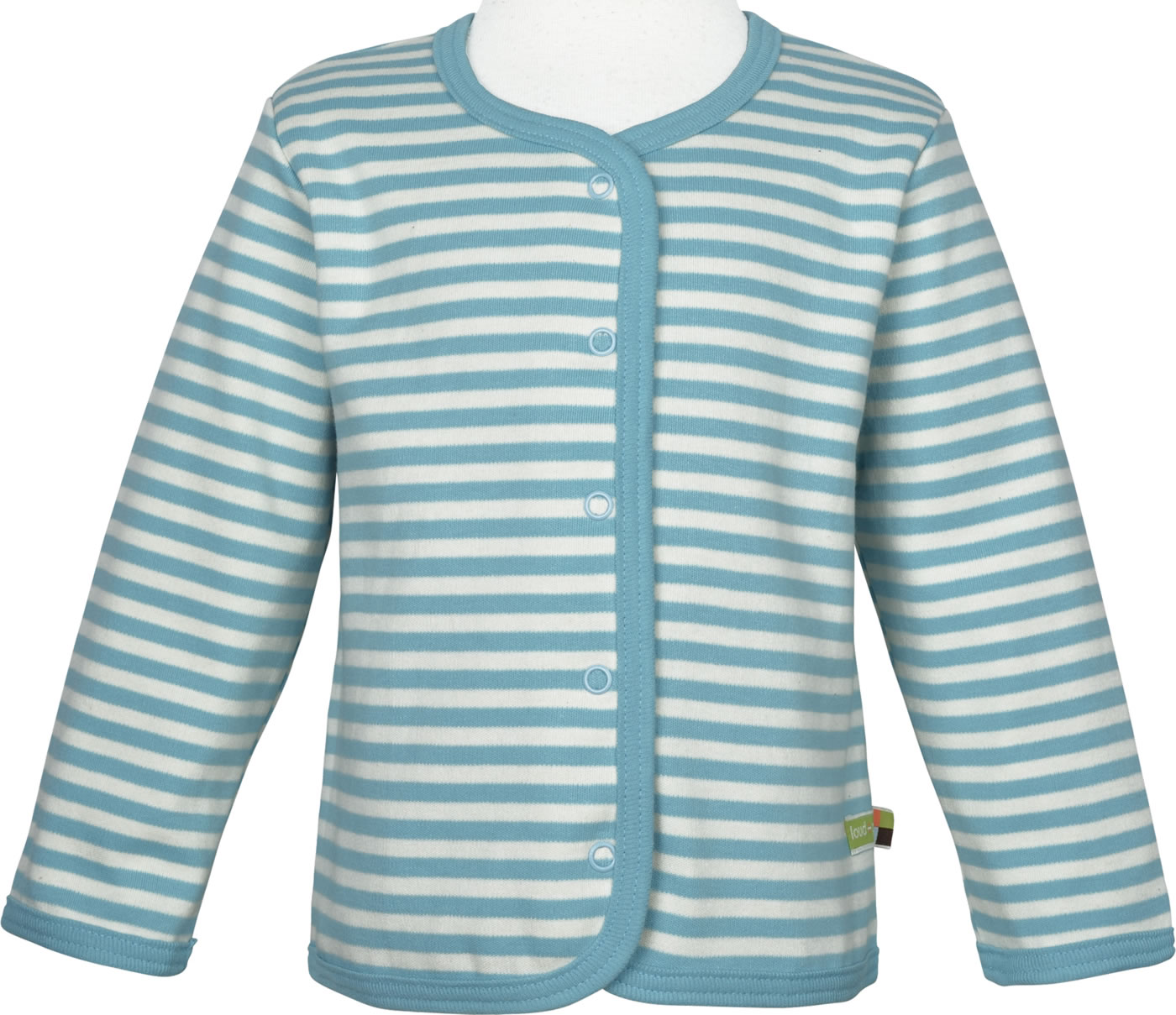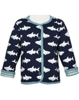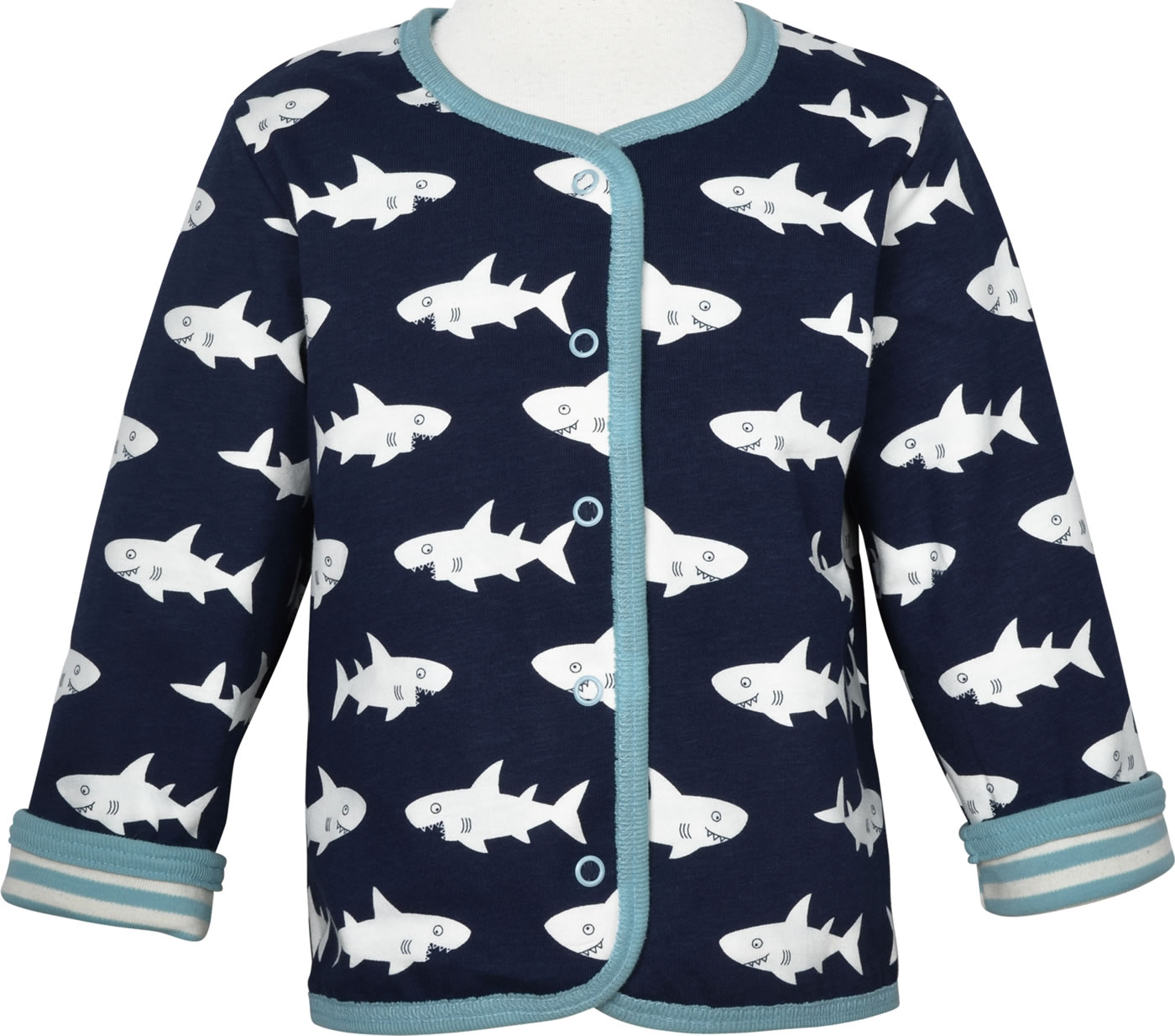 Schöne Sweat-Jacke zum Wenden von LOUD + PROUD. Die mit Haien bedruckte Seite ist aus Jersey und die gringelte Seite aus Interlock gefertigt. Verschlossen wird die Jacke mit Druckknöpfen.