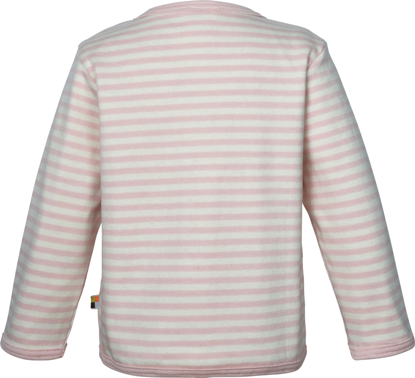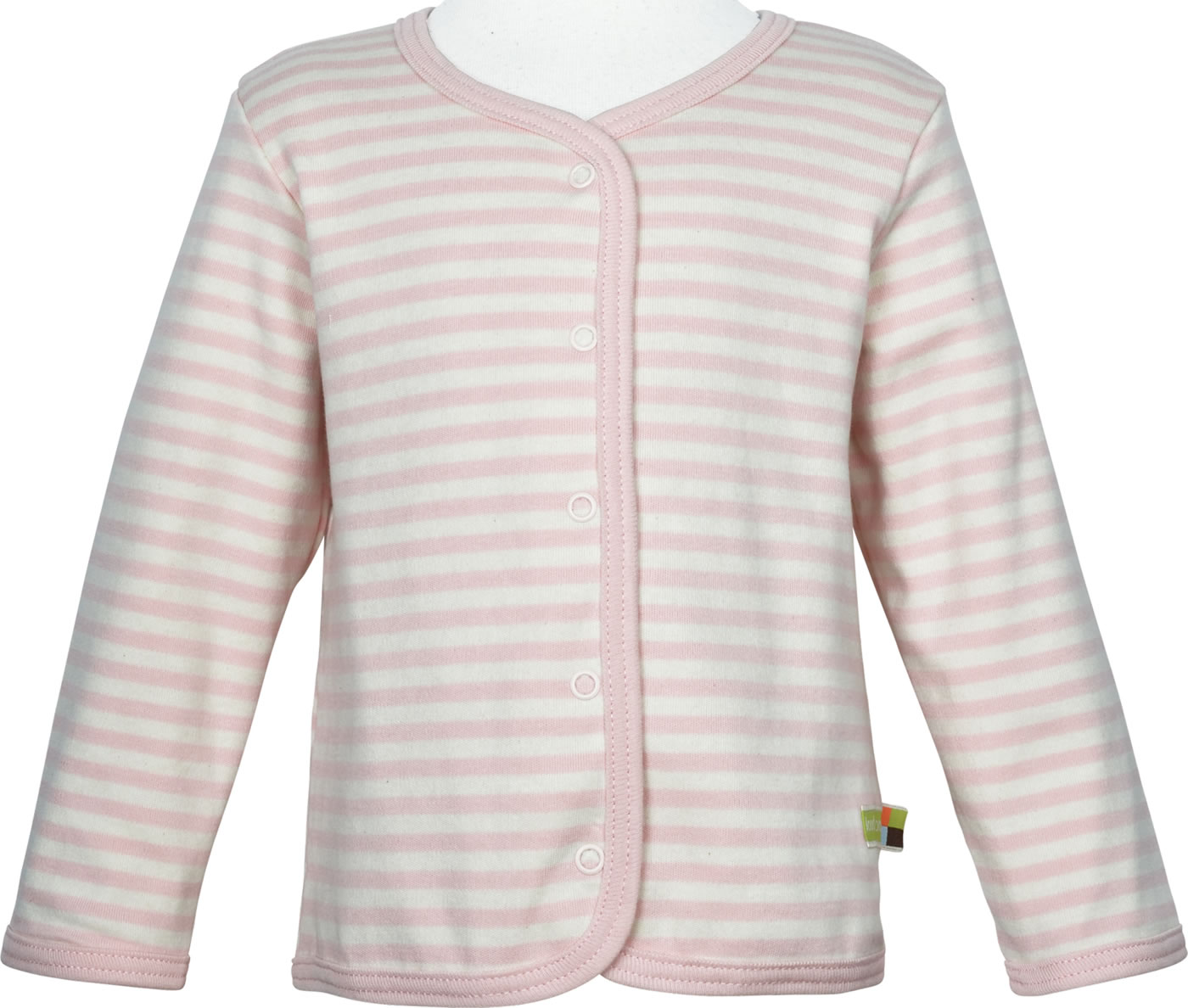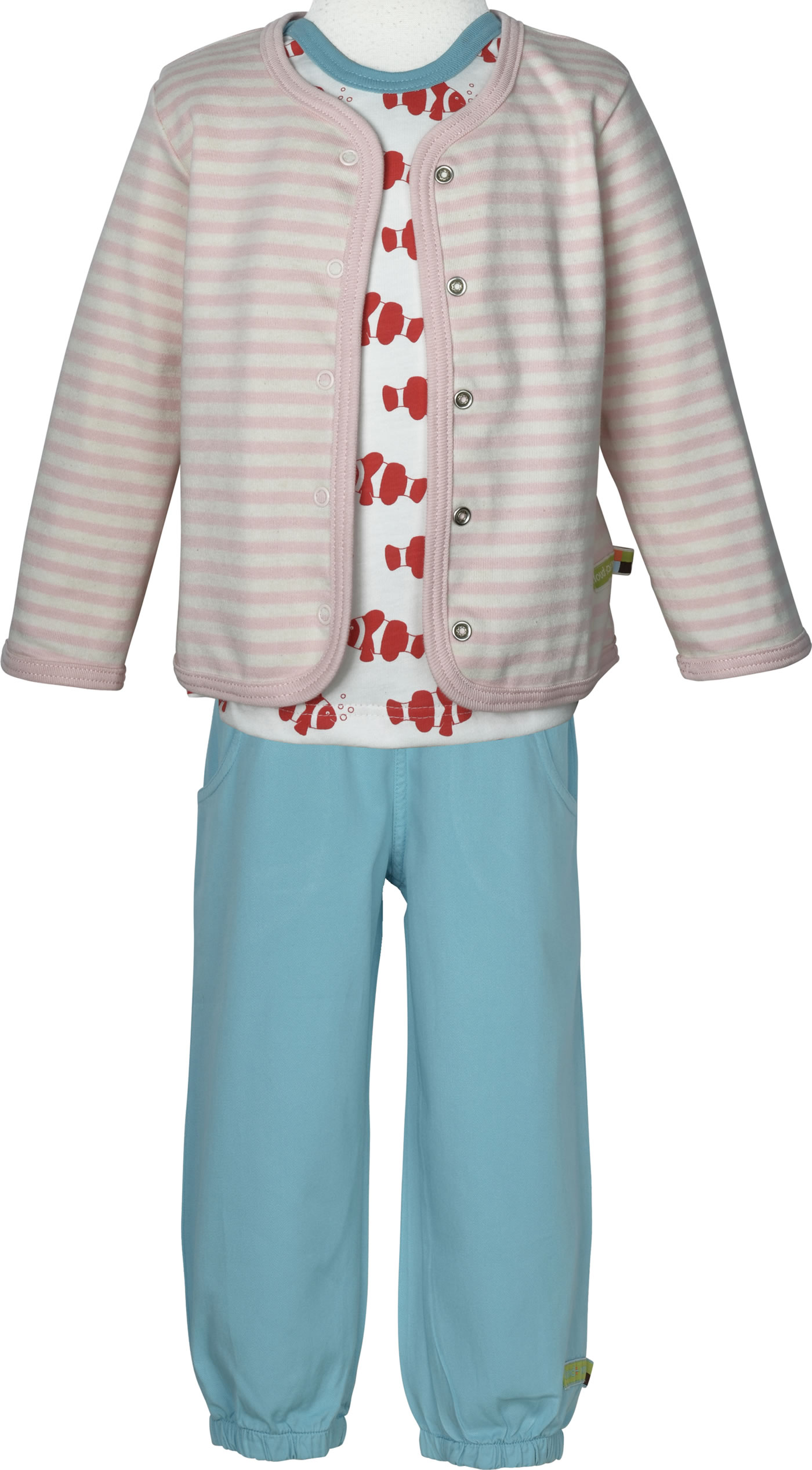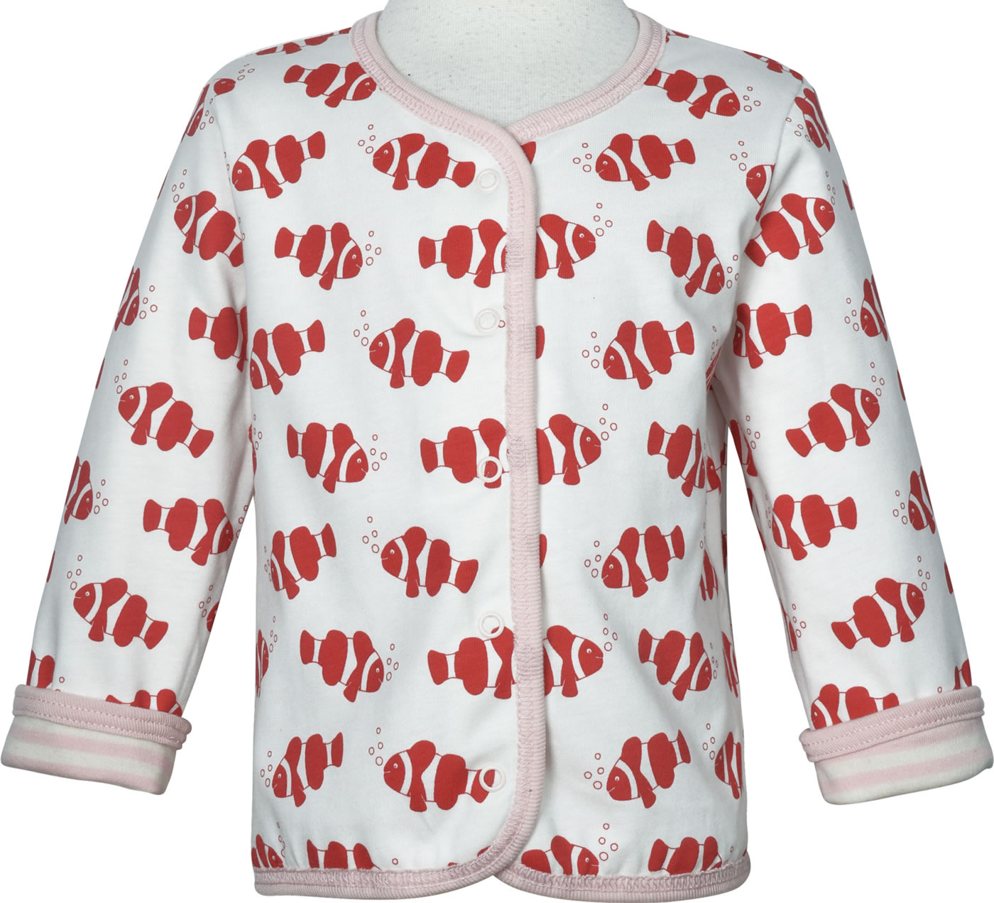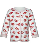 Schöne Sweat-Jacke zum Wenden von LOUD + PROUD. Die mit Fischen bedruckte Seite ist aus Jersey und die gringelte Seite aus Interlock gefertigt. Verschlossen wird die Jacke mit Druckknöpfen.