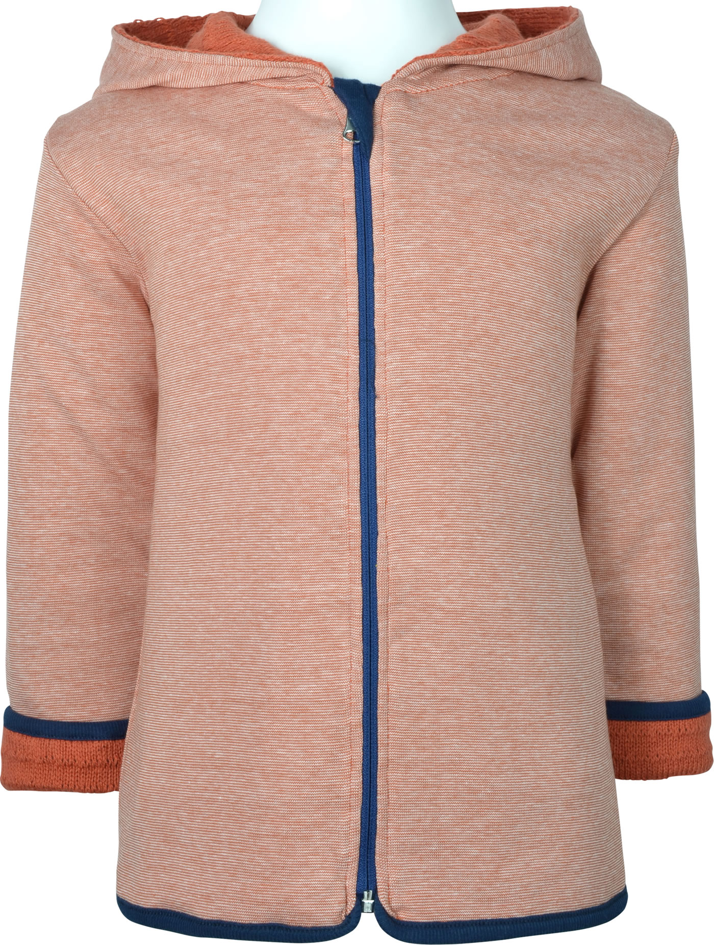 Die farbenfrohe Wende-Jacke mit Kapuze von LOUD + PROUD kann von beiden Seiten getragen werden und lässt so eine vielzahl von Kombinationsmöglichkeiten nach Lust und Laune zu. Die eine Seite ist aus weichem Jersey und die andere Seite hat ein Strickmuster. Die Bündchen und der Reißverschluss mit Kinnschutz sind in einer Kontrastfarbe gearbeitet.