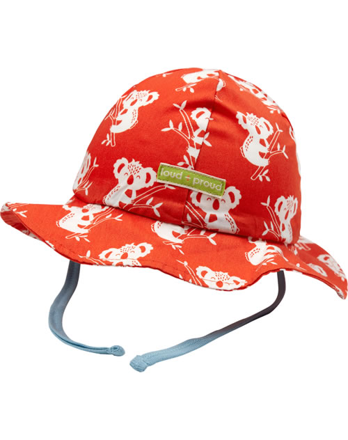 Outdoor-Hut aus 100 % organischer Baumwolle von LOUD + PROUD. Die lustigen Koalas machen diesen Hut mit farbig abgesetztem Band zum Binden zu einem echten Blickfang. Die atmungsaktive BIONIC-FINISH ECO-Imprägnierung ist fluorfrei und macht den Hut wasser- und schmutzabweisend. Der Hut ist besonders leicht und das Material sorgt für einen hohen Tragekomfort.