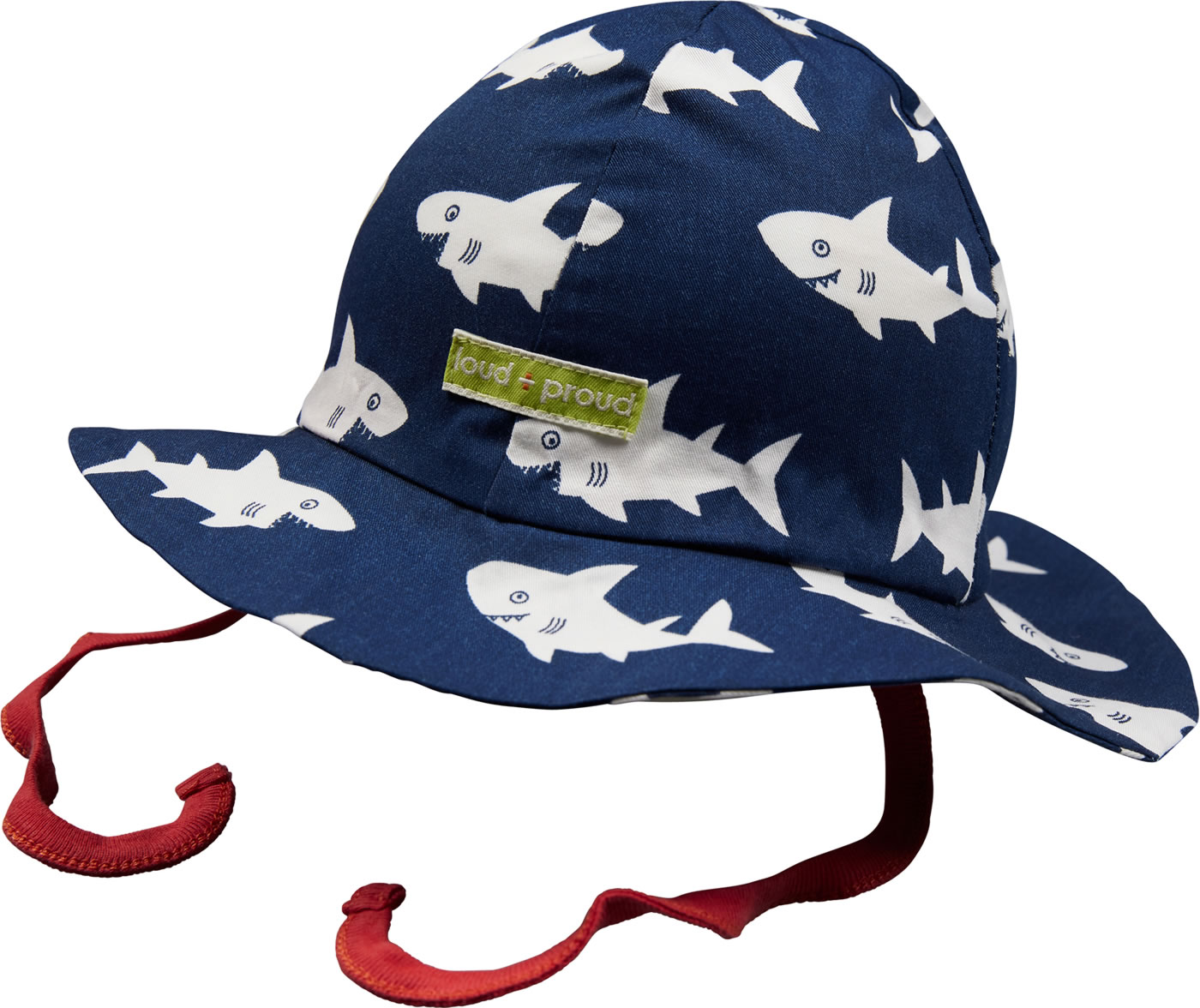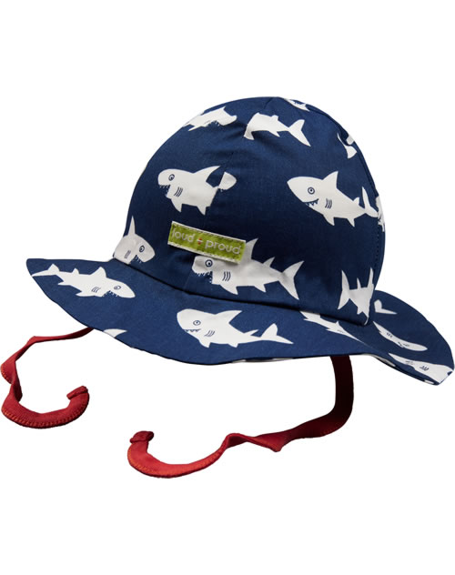 Outdoor-Hut aus 100 % organischer Baumwolle von LOUD + PROUD. Das Hai-Muster machen diesen Hut mit farbig abgesetzten Band zum Binden zu einem echten Blickfang. Die atmungsaktive BIONIC-FINISH ECO-Imprägnierung ist fluorfrei und macht ihn wasser- und schmutzabweisend. Der Hut ist besonders leicht und das Material sorgt für einen hohen Tragekomfort.