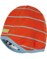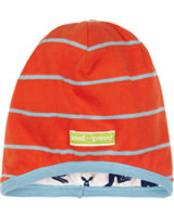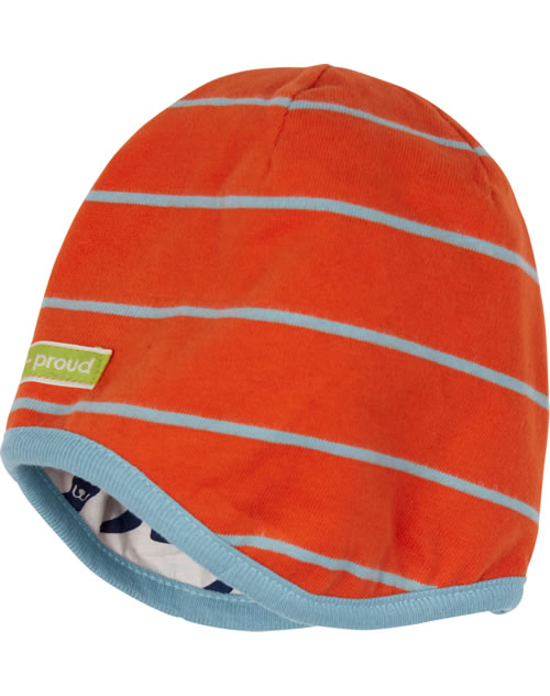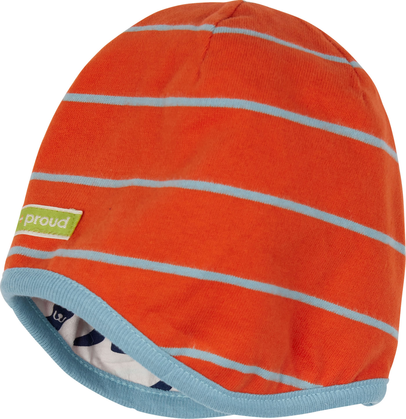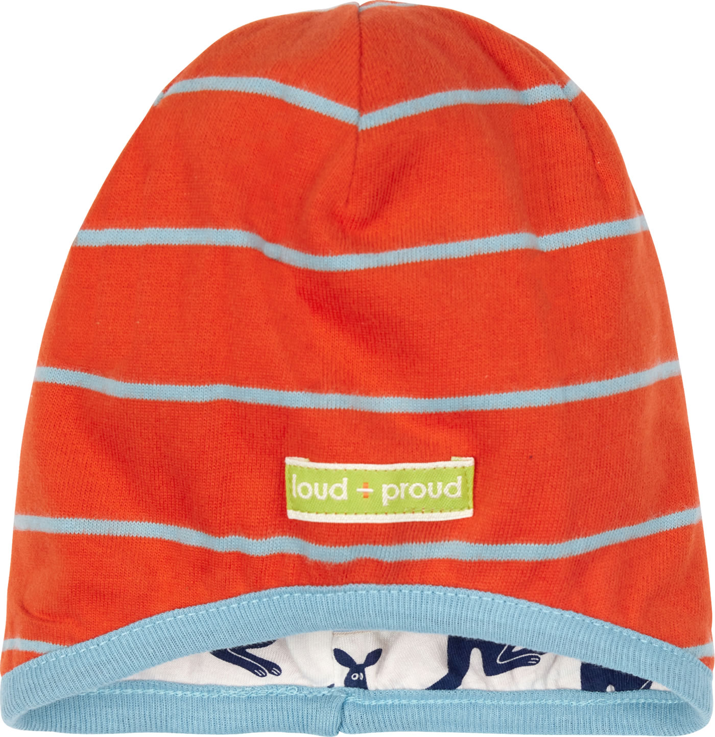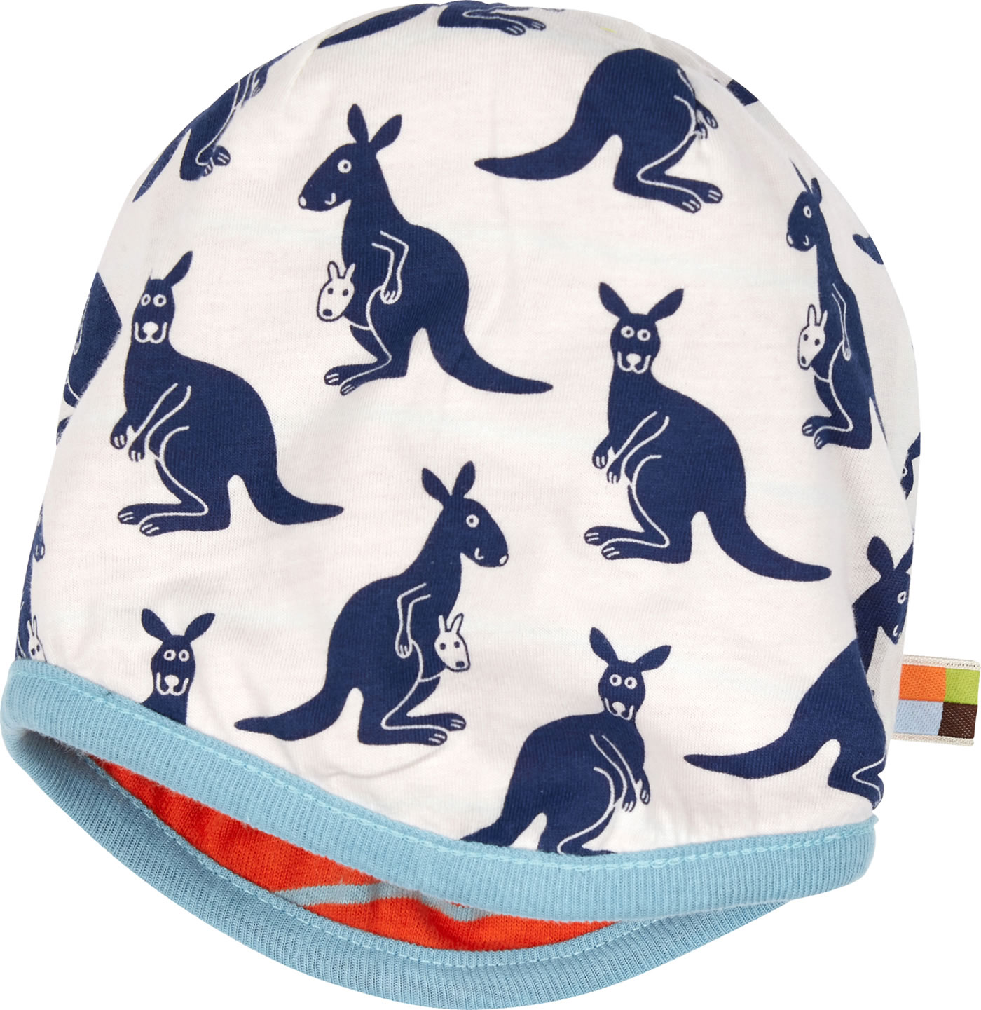 Doppellagige Wendemütze aus weichem Baumwolljersey von LOUD + PROUD. Je nach Lust und Laune kann die geringelte Seite oder die Seite mit den Kängurus getragen werden.