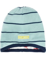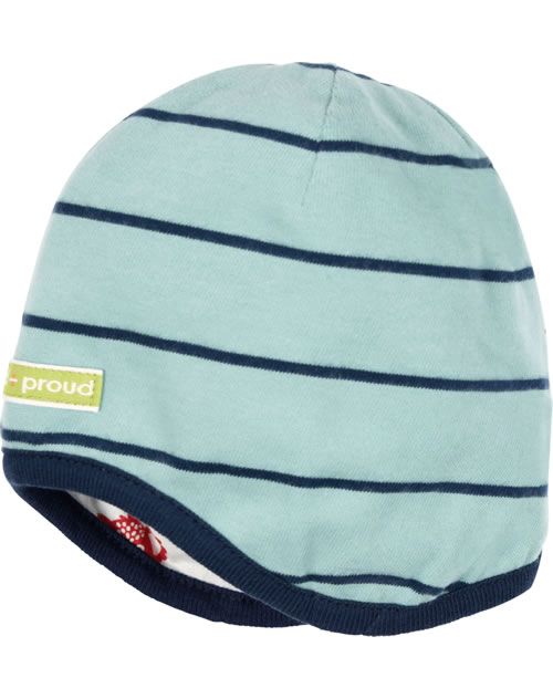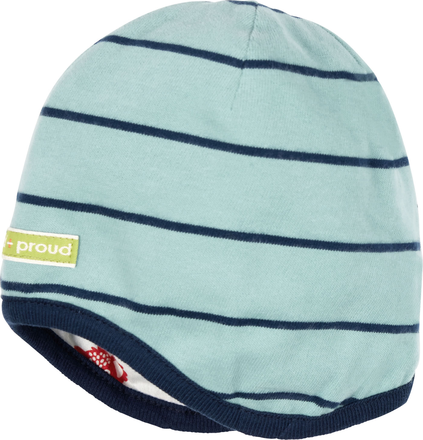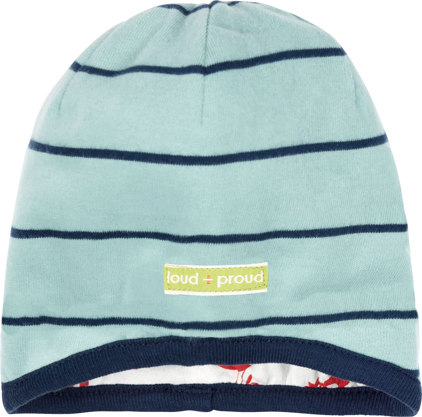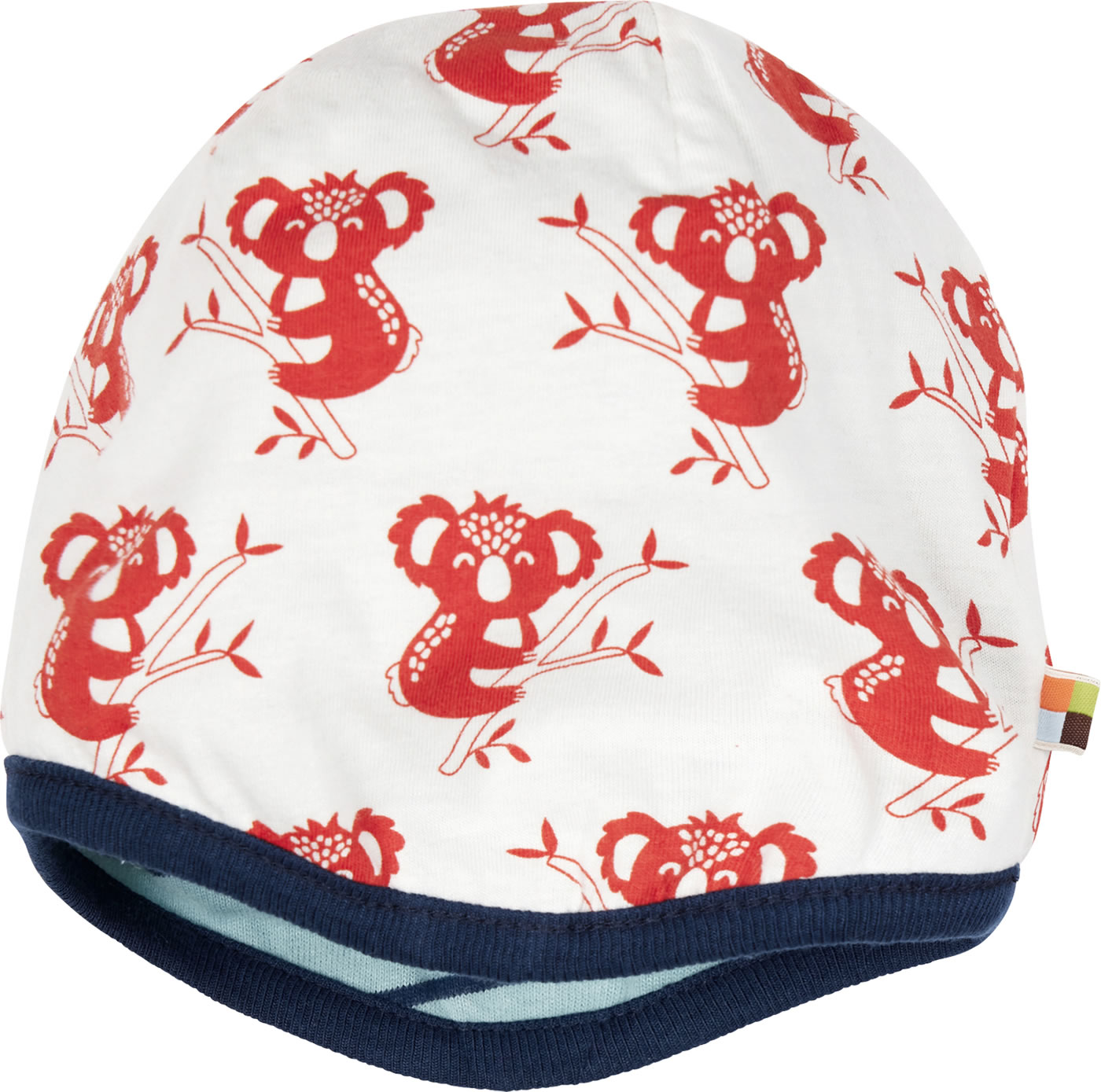 Doppellagige Wendemütze aus weichem Baumwolljersey von LOUD + PROUD. Je nach Lust und Laune kann die geringelte Seite oder die Seite mit den Koalas getragen werden.