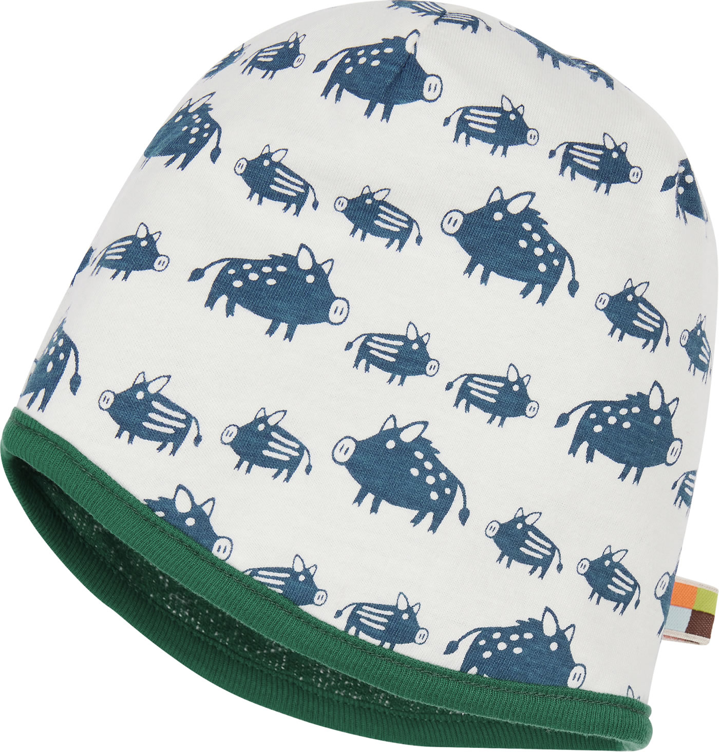 Tolle Wendemütze aus Strick von LOUD + PROUD. Die gestrickte Seite ist meliert, die Jersey-Seite hat einen tollen Wildschwein-Print.