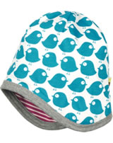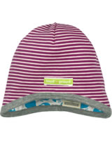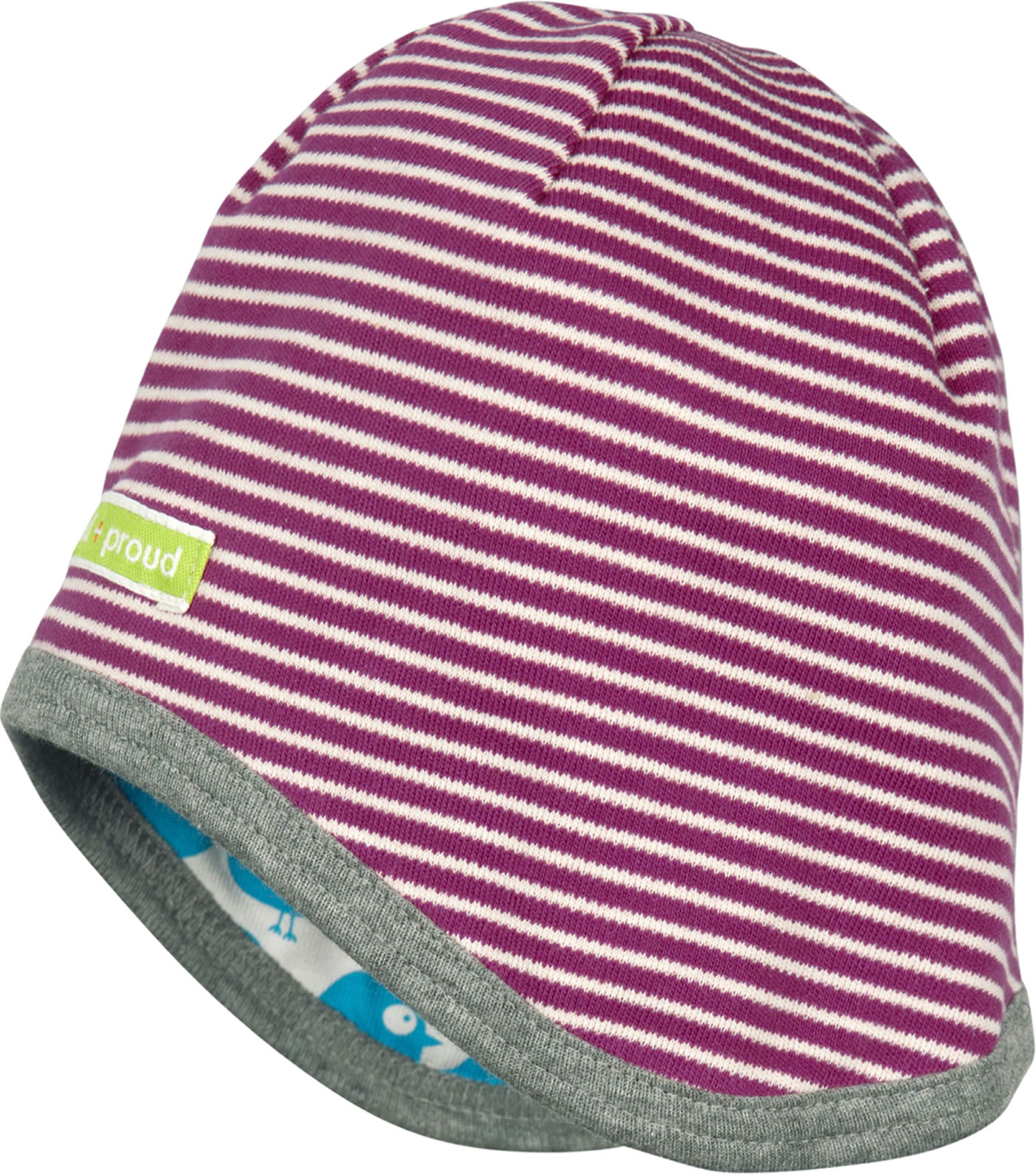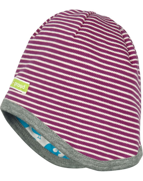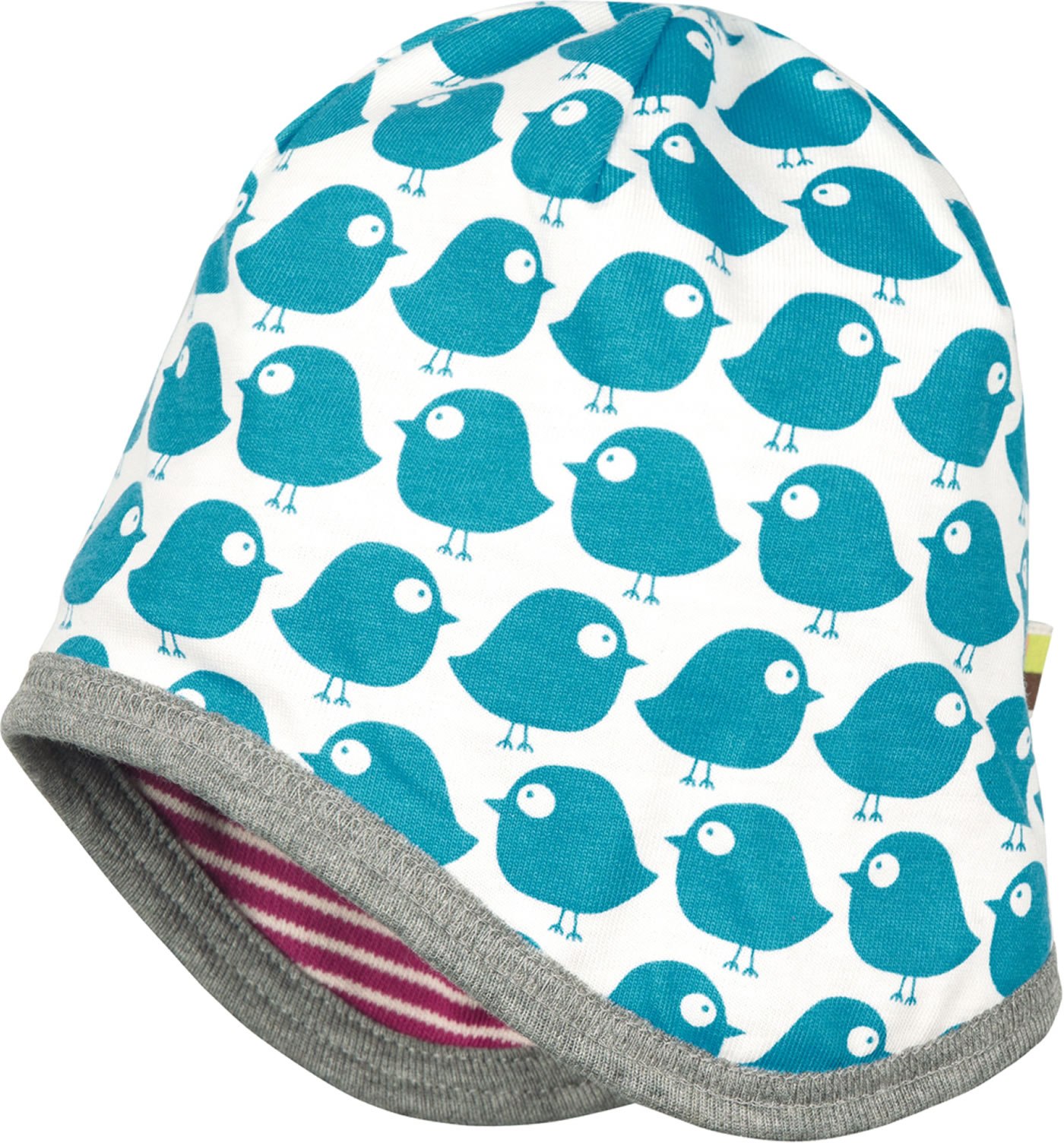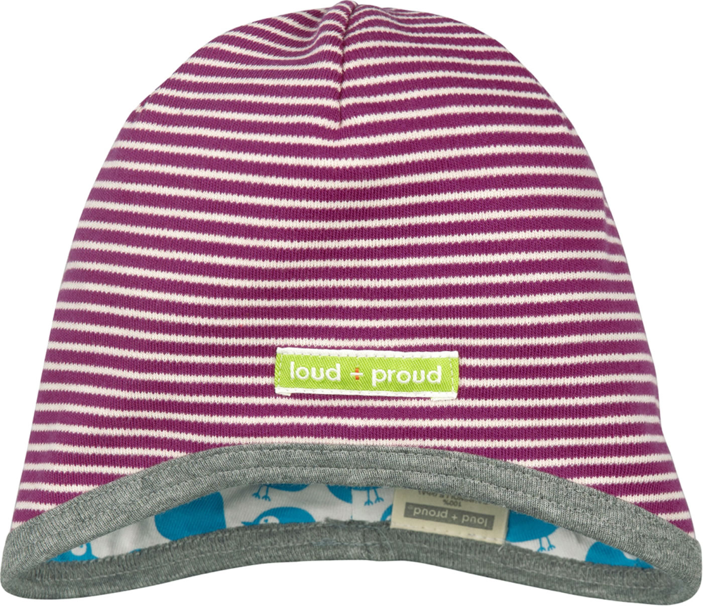 Tolle Wendemütze aus weicher Sweatware von LOUD + PROUD mit Ohrenwärmern. Die eine Seite ist mit Vogel-Alloverprint, die Wende-Seite ist gestreift. Der Saum ist kontrastfarbig eingefasst.