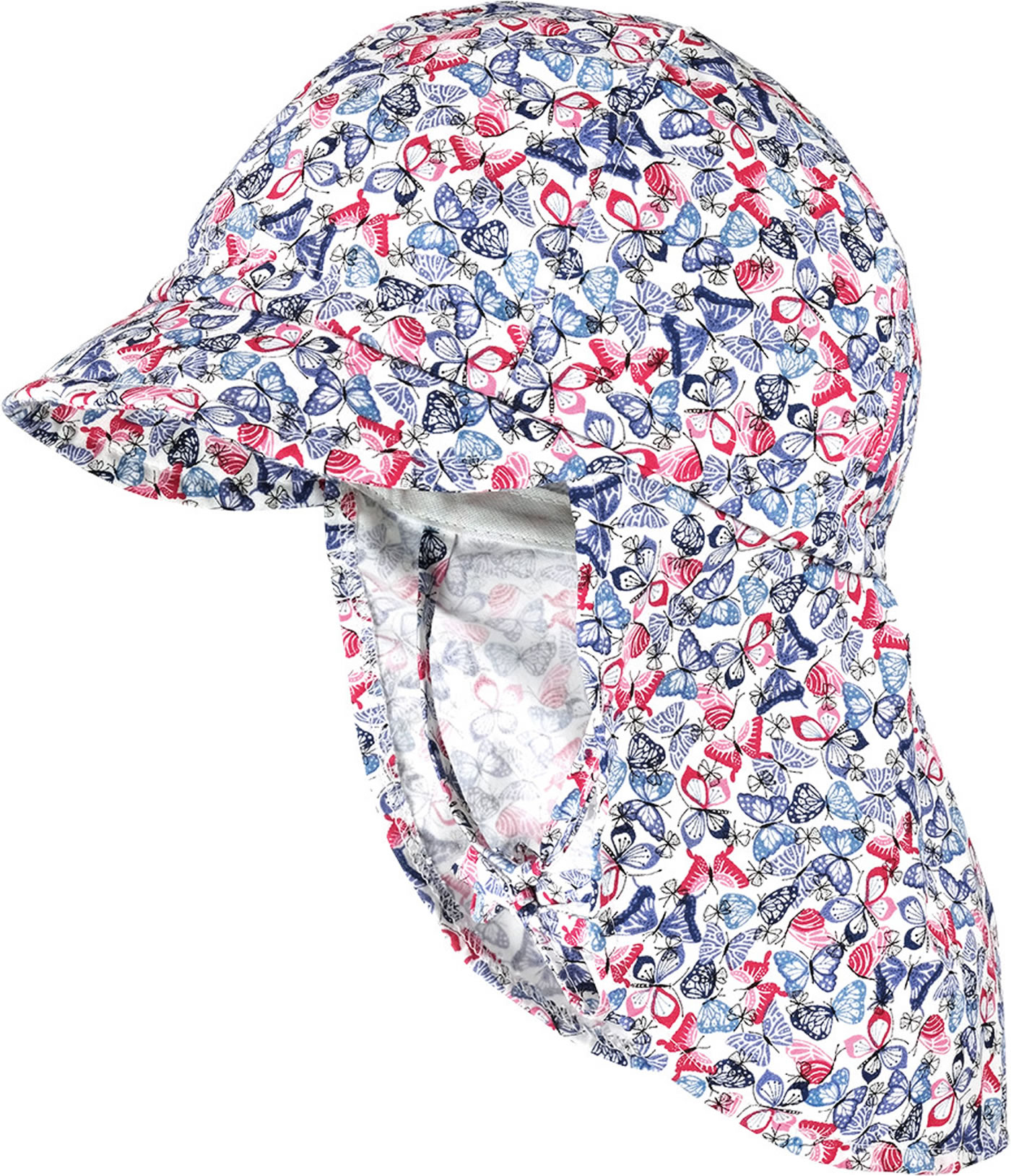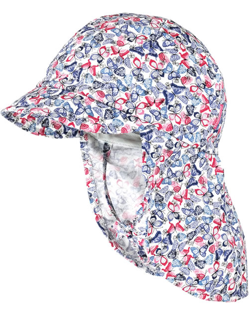 Sommerliche Mütze mit Schirm in rot-blau und Schmetterlingmotiven von MAXIMO mit Nackenschutz und Bindeband.