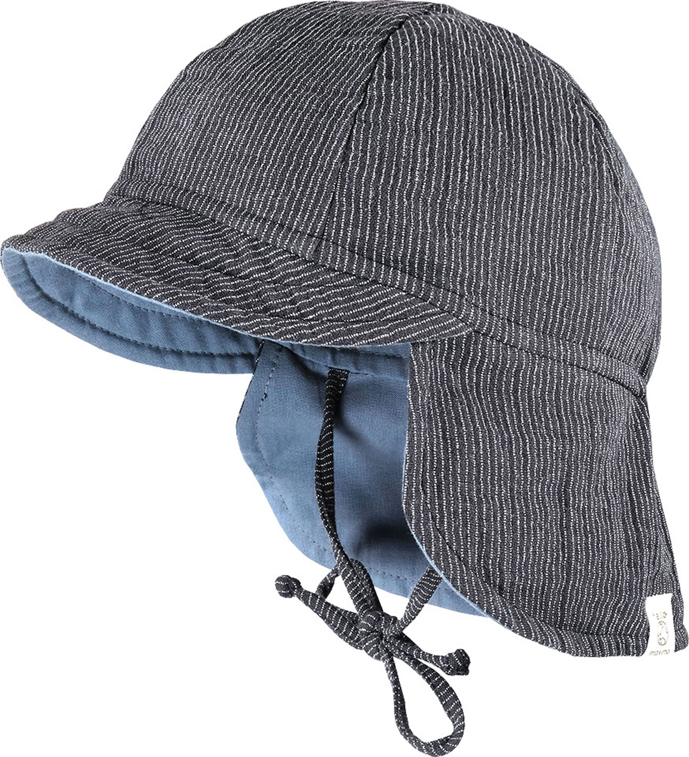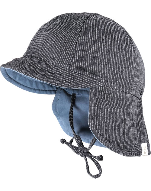 Sommerliche Mütze mit Schirm in anthrazit-weiß und gestreift von MAXIMO mit Nackenschutz und Bindeband.