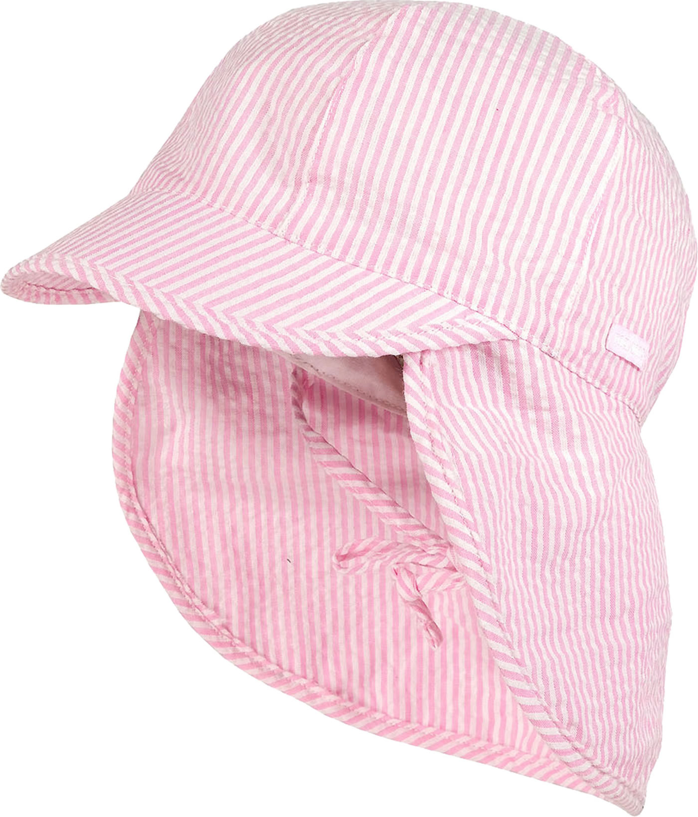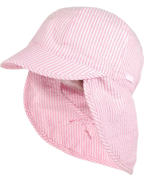 Sommerliche Mütze mit Schirm für Mädchen in rosa-weiß gestreift von MAXIMO mit Nackenschutz und Bindeband.
