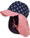 Schild, Nackenschutz und Bindeband sind blau-weiß gestreift.