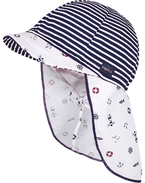 Sommerlicher Sonnenhut für Jungen und Mädchen in blau-weiß gestreift von MAXIMO mit Nackenschutz und Bindeband.