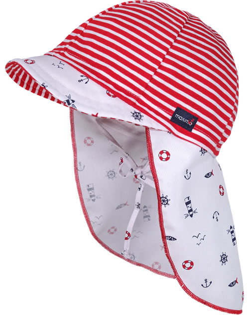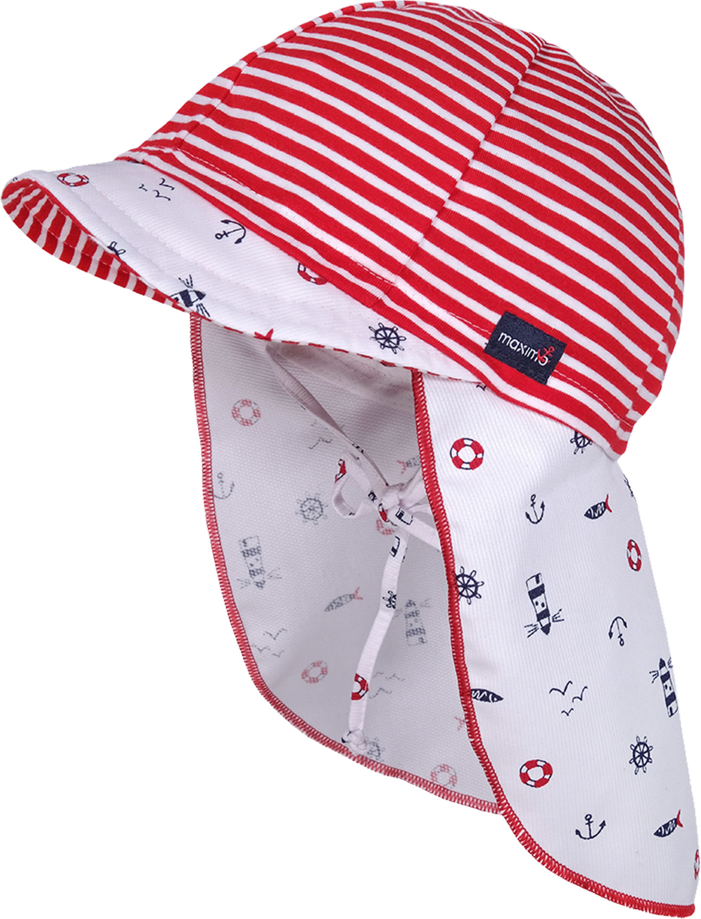 Sommerlicher Sonnenhut für Jungen und Mädchen in rot-weiß gestreift von MAXIMO mit Nackenschutz und Bindeband.