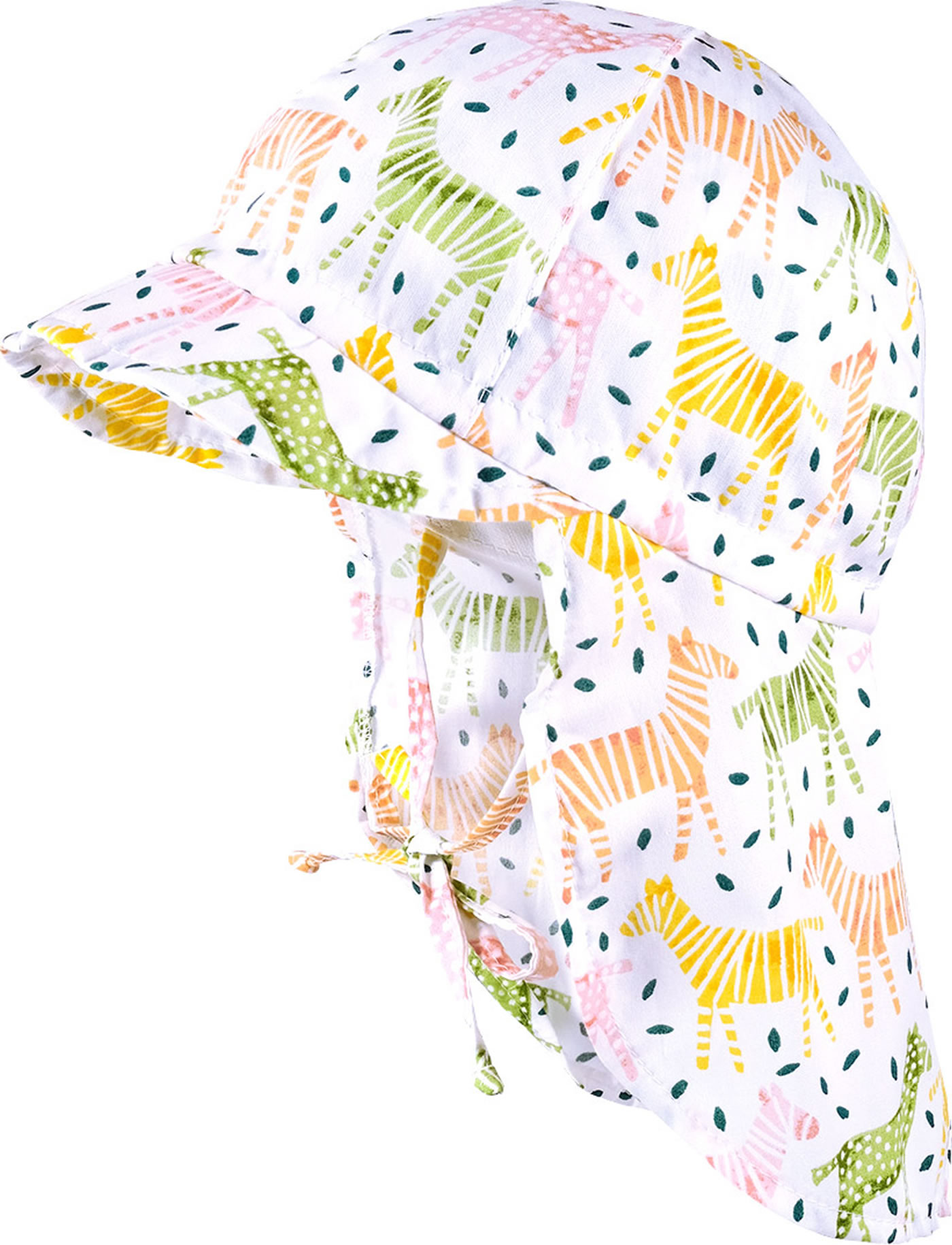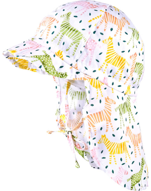 Sommerliche Schildmütze aus Baumwolle in weiß mit bunten Zebramotiven von MAXIMO. Der lange Nackenschutz bietet guten Schutz vor der Sonne und das Bindeband sorgt für den richtigen Halt am Köpfchen.