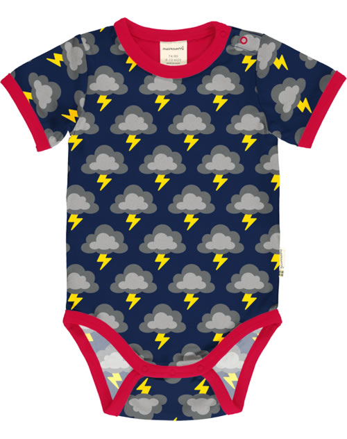 Farbenfroher Kurzarm-Body mit Gewitter-Motiven von MAXOMORRA. Die Knöpfe am Halsausschnitt und im Schritt machen das An- und Ausziehen zu einem Kinderspiel. Das weiche Material bietet einen hohen Tragekomfort.