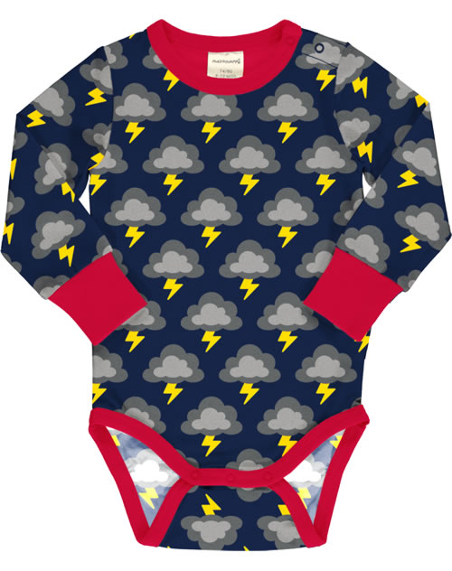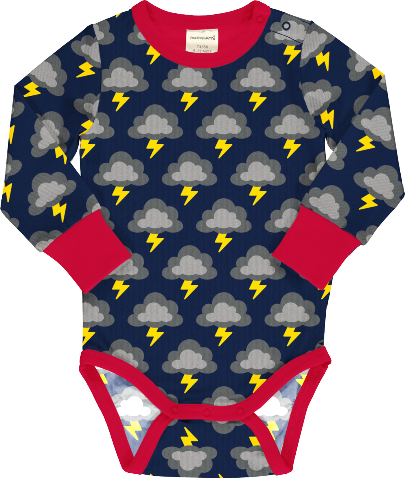 Langarm-Body in blau mit tollem Gewitter-Motiv von MAXOMORRA. Die Knöpfe am Halsausschnitt und im Schritt machen das An- und Ausziehen zu einem Kinderspiel. Das weiche Material bietet einen hohen Tragekomfort.