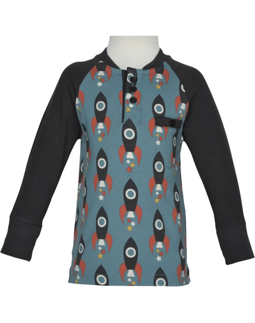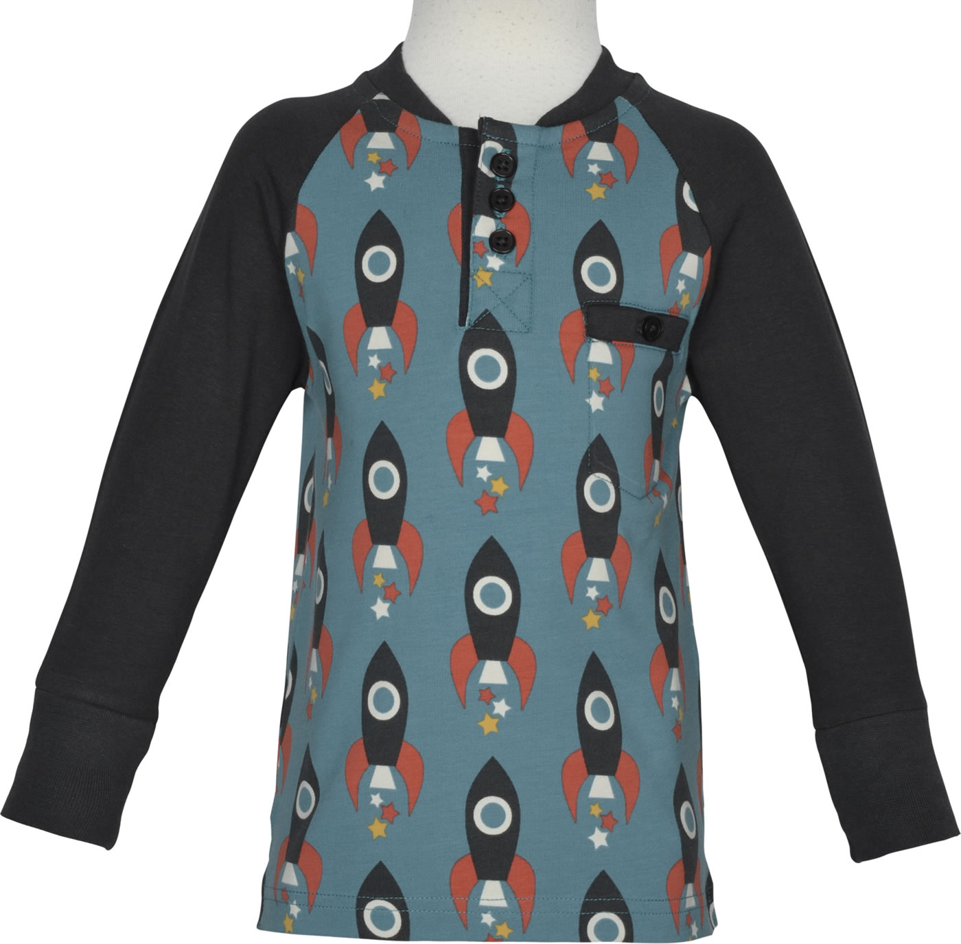 Baseball-Shirt in blau mit langen Ärmeln und tollem Mondraketen-Motiv von MAXOMORRA. Schöne Details sind die in petrol abgesetzten Ärmel sowie die Knopfleiste am Halsausschnitt und die kleine Brusttasche. Der gerade Schnitt und das weiche Material sorgen für einen hohen Tragekomfort.