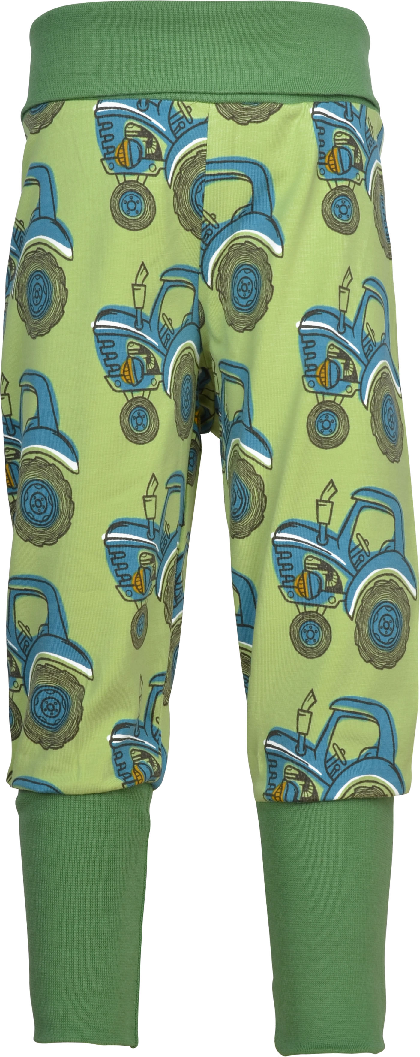 Gemütliche Bund-Hose in grün mit buntem Traktor-Motiv von MAXOMORRA. Das beliebte Kleidungsstück hat einen breiten, weichen Gummibund, der das An- und Ausziehen zum Kinderspiel macht. Das weiche Jersey-Material sorgt für einen hohen Tragekomfort.