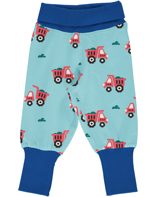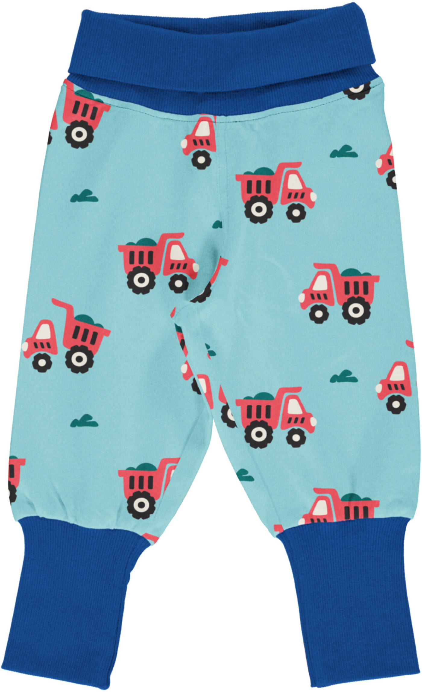 Gemütliche Bundhose in blau mit Kipplaster-Motiven von Maxomorra. Das beliebte Kleidungsstück hat einen breiten, weichen Gummibund, der das An- und Ausziehen zum Kinderspiel macht.