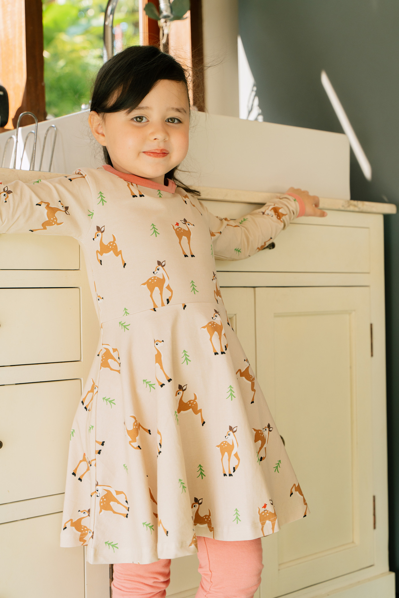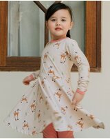 Dieses schöne langärmlige Kleid von Maxomorra ist im Grundton Beige gehalten und entzückt mit vielen abgebildeten Rehen und Tännchen. 🦌🌲