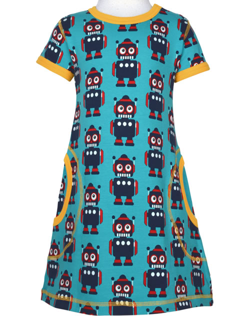 Schönes Kurzarm-Kleid mit Roboter-Muster von MAXOMORRA. Das peppige Design machen dieses hübsche Kleid zu einem tollen Blickfang. Das weiche Material sorgt für einen angenehmen Tragekomfort. Abgerundete, aufgesetzte Taschen auf der Vorderseite bieten Platz für Kleinigkeiten. Ab Größe 98/104 ohne Druckknöpfe an der Schulter.