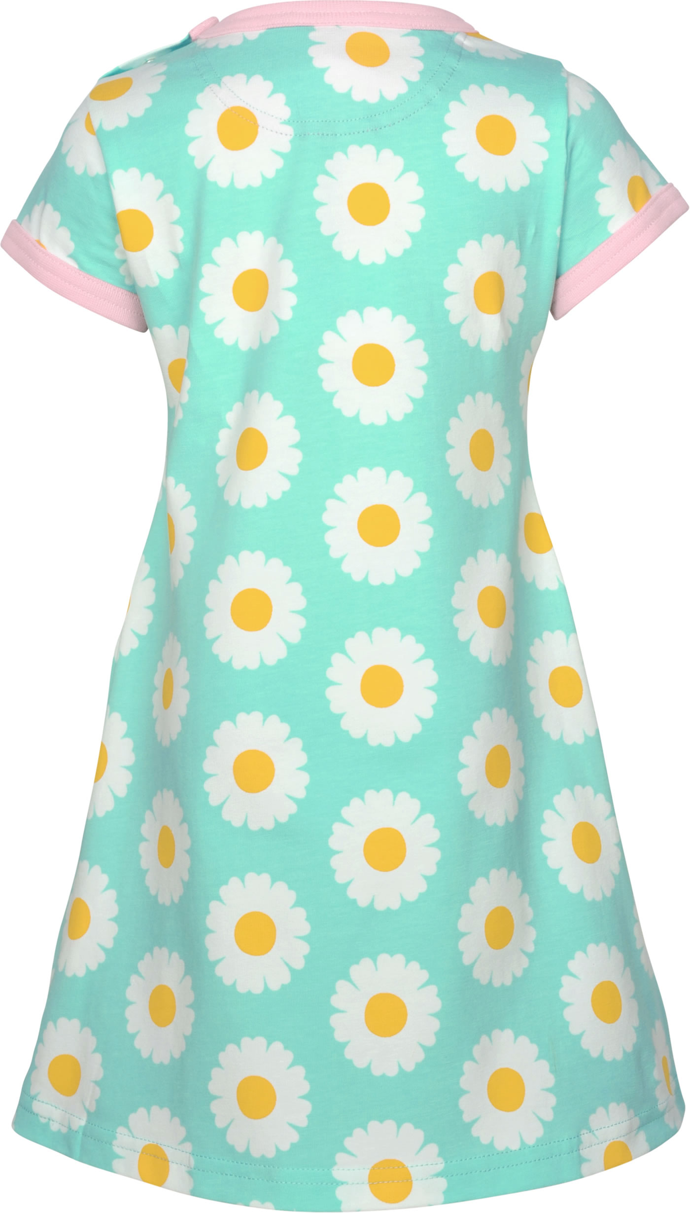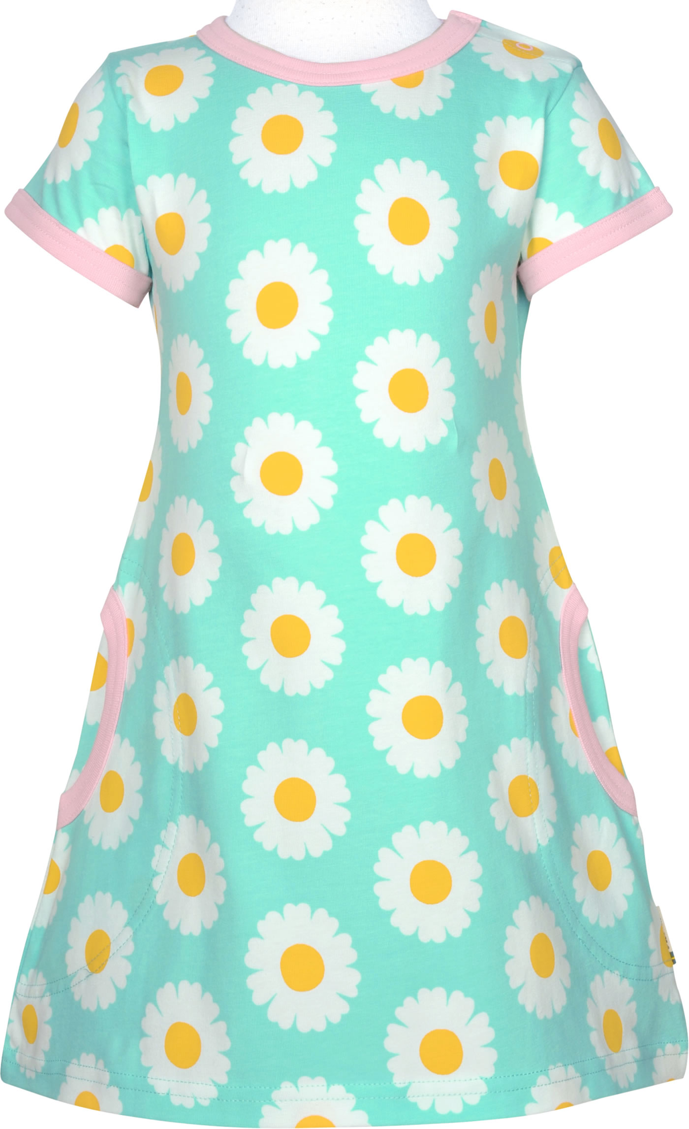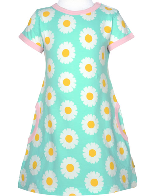 Schönes Kurzarm-Kleid mit hübschem Gänseblümchen-Muster von MAXOMORRA. Das peppige Design machen dieses hübsche Kleid zu einem tollen Blickfang. Das weiche Material sorgt für einen angenehmen Tragekomfort. Abgerundete, aufgesetzte Taschen auf der Vorderseite bieten Platz für Kleinigkeiten. Ab Größe 98/104 ohne Druckknöpfe an der Schulter.