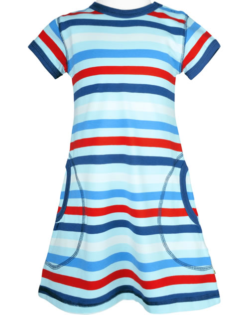 Schönes Kurzarm-Kleid mit bunten Streifen von MAXOMORRA. Das peppige Design machen dieses hübsche Kleid zu einem tollen Blickfang. Das weiche Material sorgt für einen angenehmen Tragekomfort. Abgerundete, aufgesetzte Taschen auf der Vorderseite bieten Platz für Kleinigkeiten. Ab Größe 98/104 ohne Druckknöpfe an der Schulter.