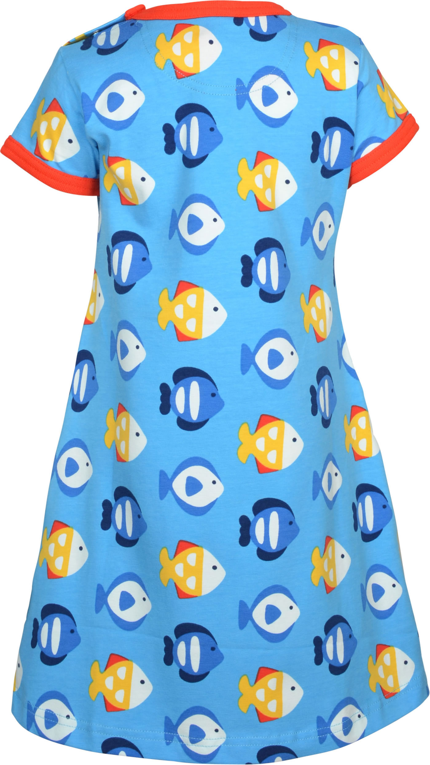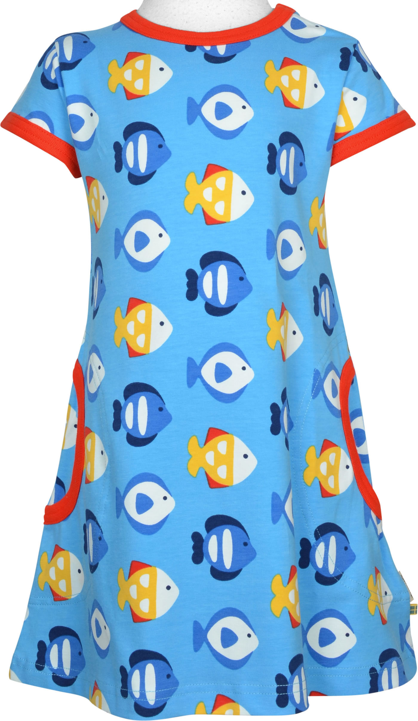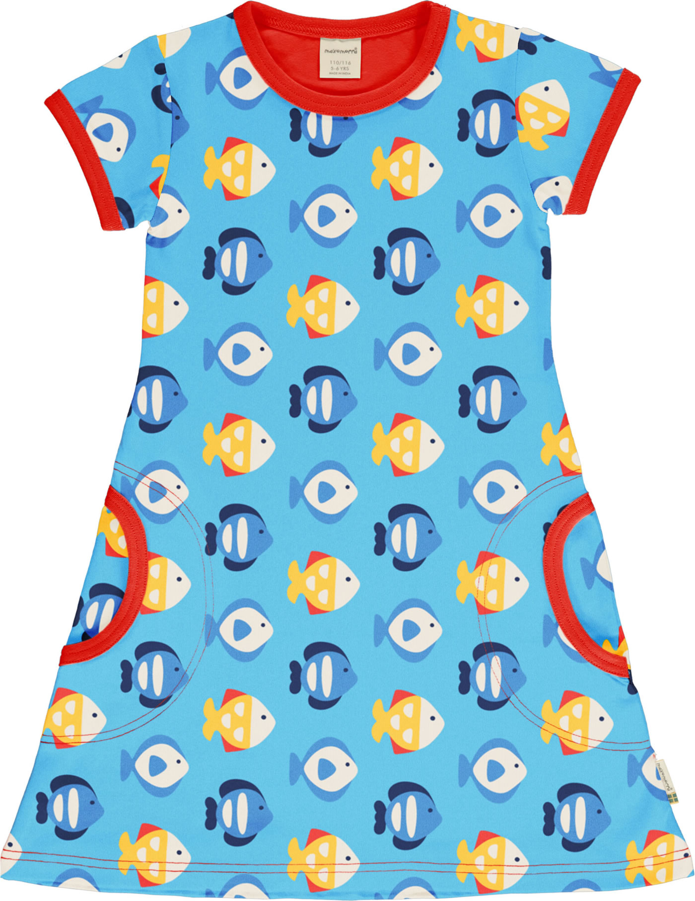 Schönes Kurzarm-Kleid mit Fische-Muster von MAXOMORRA. Das peppige Design machen dieses hübsche Kleid zu einem tollen Blickfang. Das weiche Material sorgt für einen angenehmen Tragekomfort. Abgerundete, aufgesetzte Taschen auf der Vorderseite bieten Platz für Kleinigkeiten. Ab Größe 98/104 ohne Druckknöpfe an der Schulter.