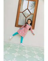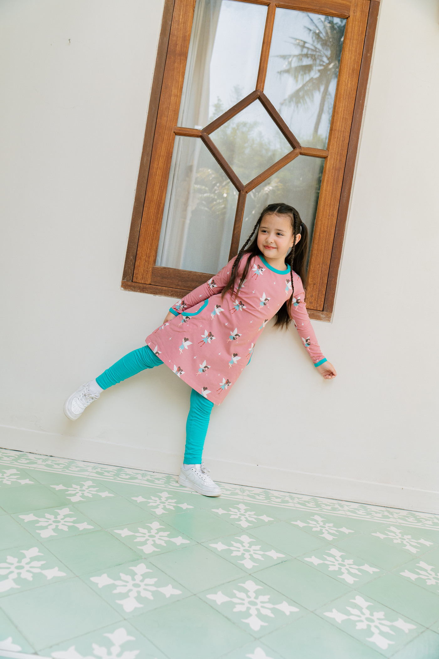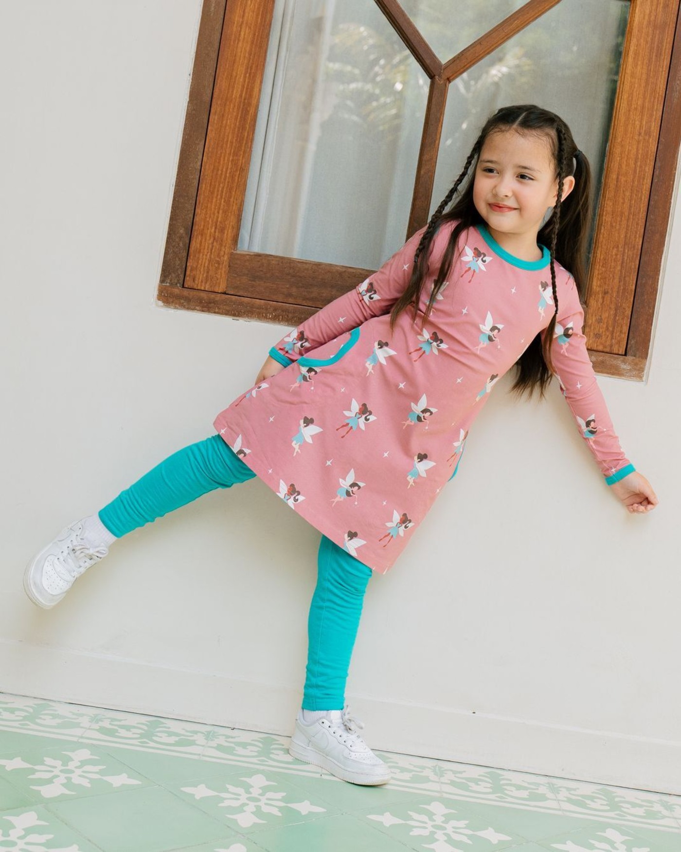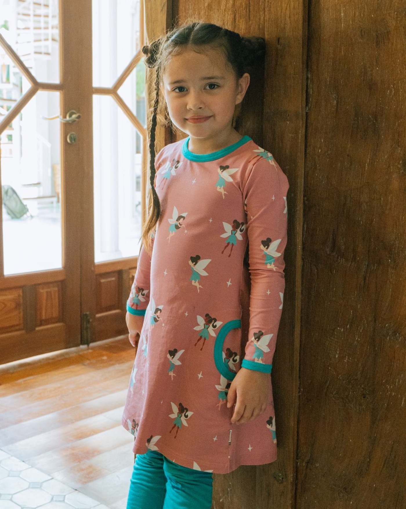 Dieses schöne langärmlige Kleid ist aus hochwertiger Bio-Baumwolle gefertigt und entzückt mit vielen verschiedenen Feen, die in türkisen Kleidern ihren Zauber verteilen. 🧚