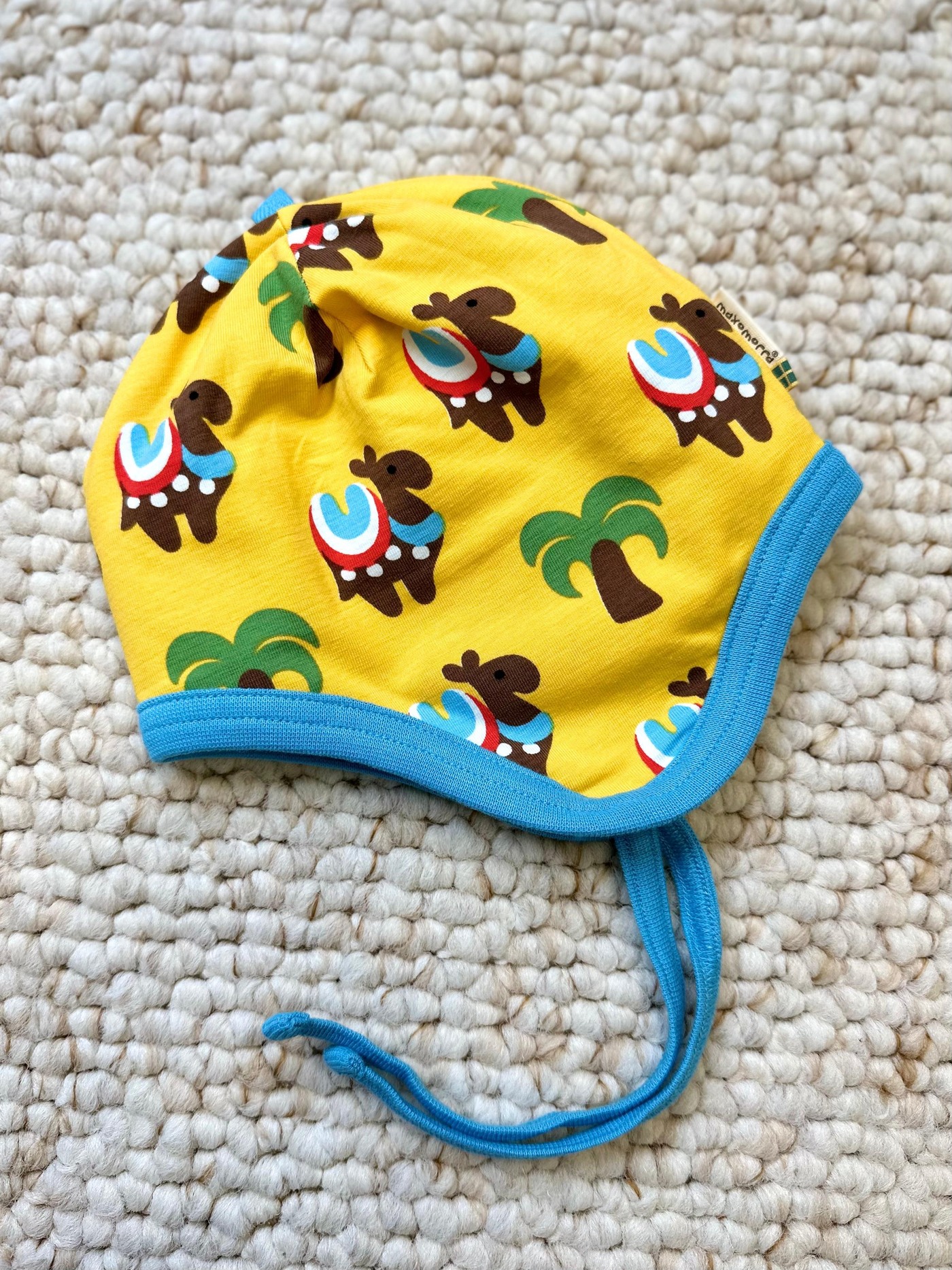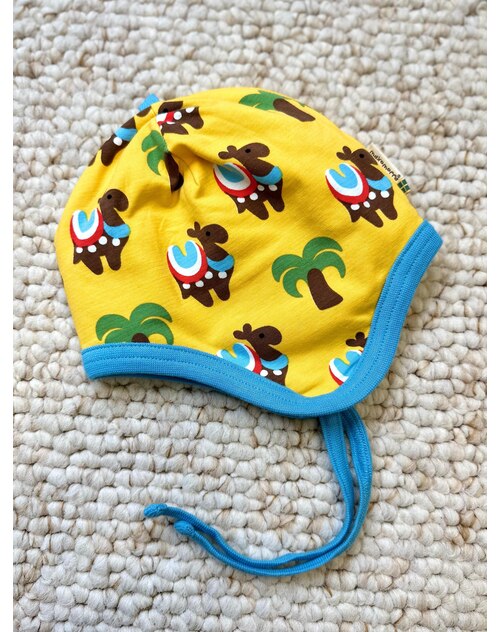 Maxomorra Mütze zum Binden aus Bio-Baumwolle KAMEL KARAWANE - Gelb/Blau
