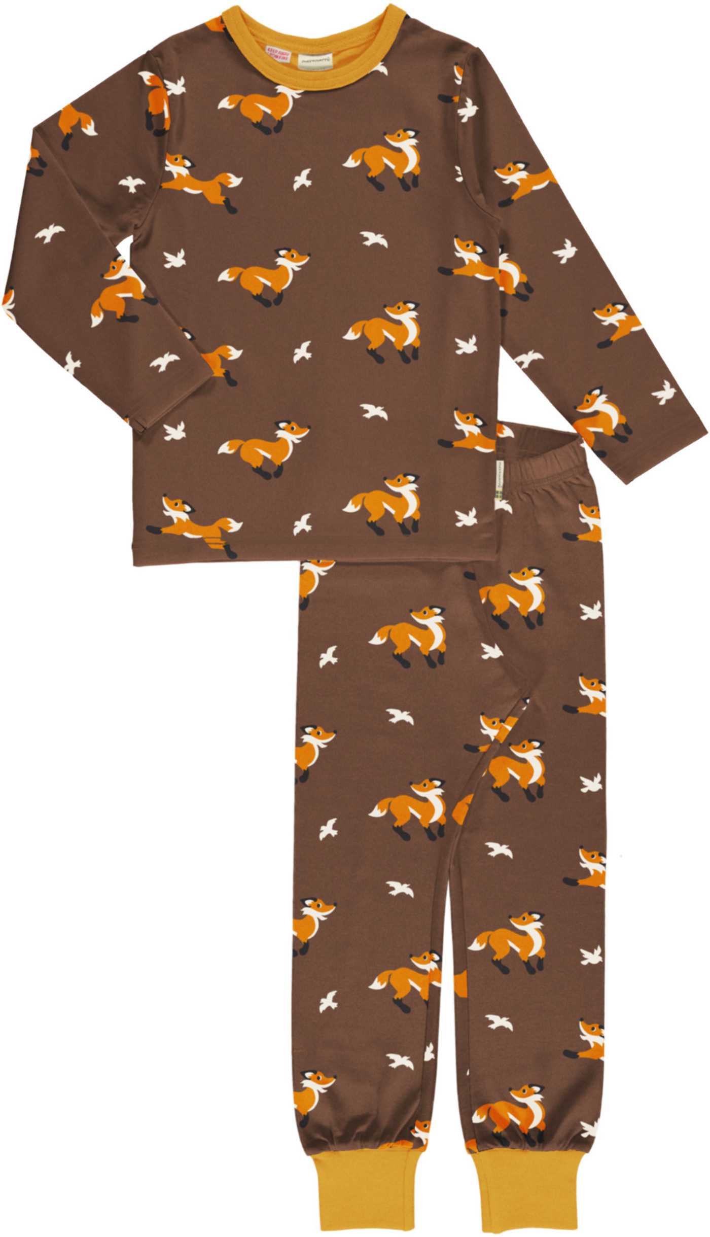 Dieses schöne Pijama-Set von Maxomorra ist im Grundton Braun gehalten und entzückt mit vielen abgebildeten Füchsen und Vögeln. 🦊🐦