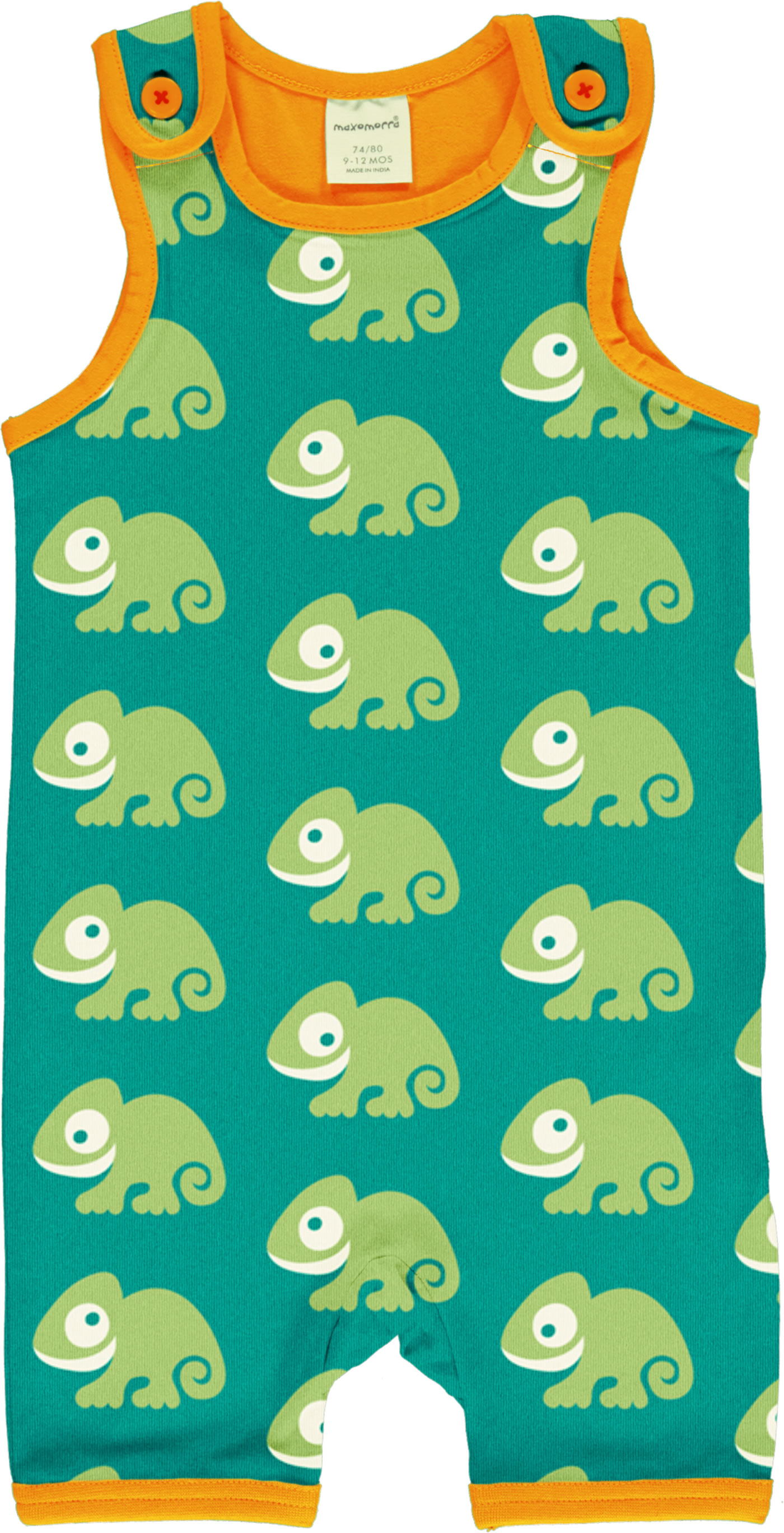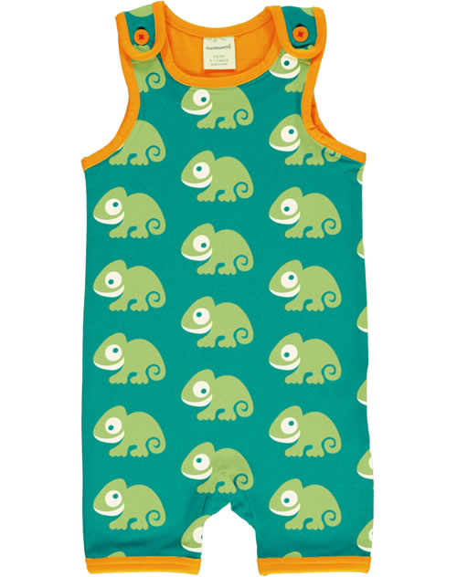 Toller Spieler in grün mit kurzen Beinen und lustigem Chamäleon-Motiv von MAXOMORRA. Die Knöpfe an den Trägern machen das An- und Ausziehen zu einem Kinderspiel. Das weiche Material bietet einen hohen Tragekomfort.
