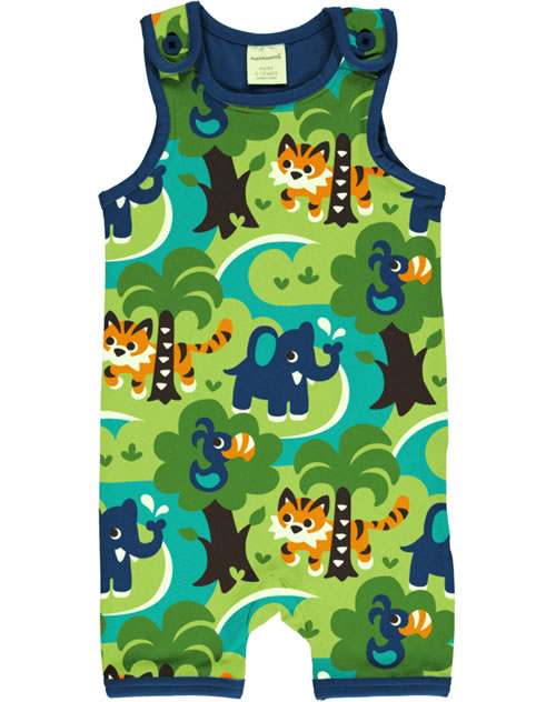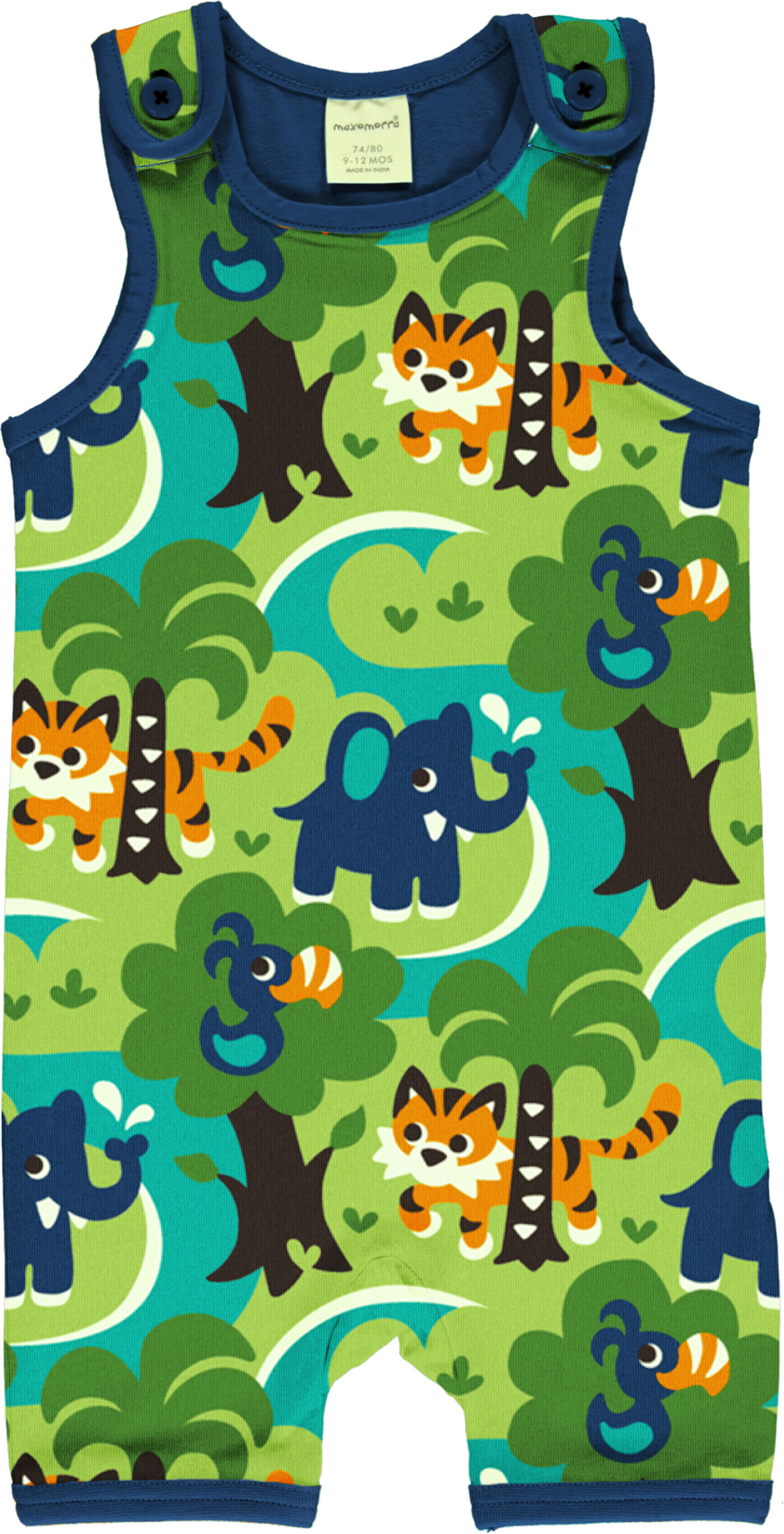 Toller Spieler in grün mit kurzen Beinen mit Dschungel-Motiv von MAXOMORRA. Die Knöpfe an den Trägern machen das An- und Ausziehen zu einem Kinderspiel. Das weiche Material bietet einen hohen Tragekomfort.
