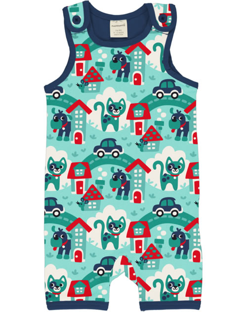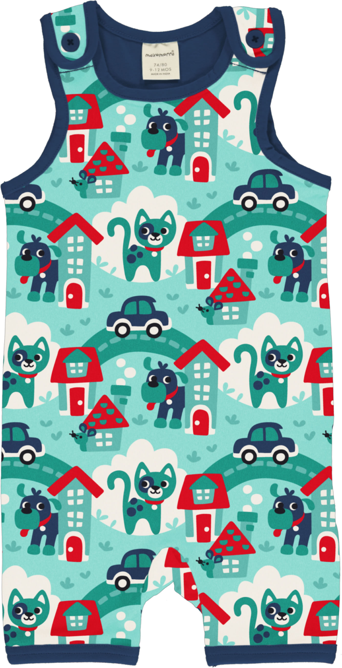 Toller Spieler mit kurzen Beinen in blau und grün mit tollem Stadt-Motiv von MAXOMORRA. Die Knöpfe an den Trägern machen das An- und Ausziehen zu einem Kinderspiel. Das weiche Material bietet einen hohen Tragekomfort.
