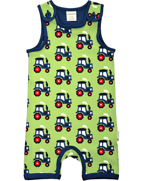 Toller ärmelloser Spieler in grün/blau mit kurzen Beinen und Traktor-Motiv von MAXOMORRA. Die Knöpfe an den Trägern machen das An- und Ausziehen zu einem Kinderspiel. Das weiche Material bietet einen hohen Tragekomfort.