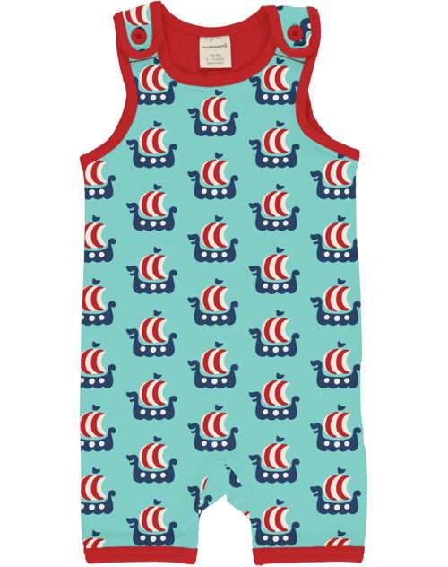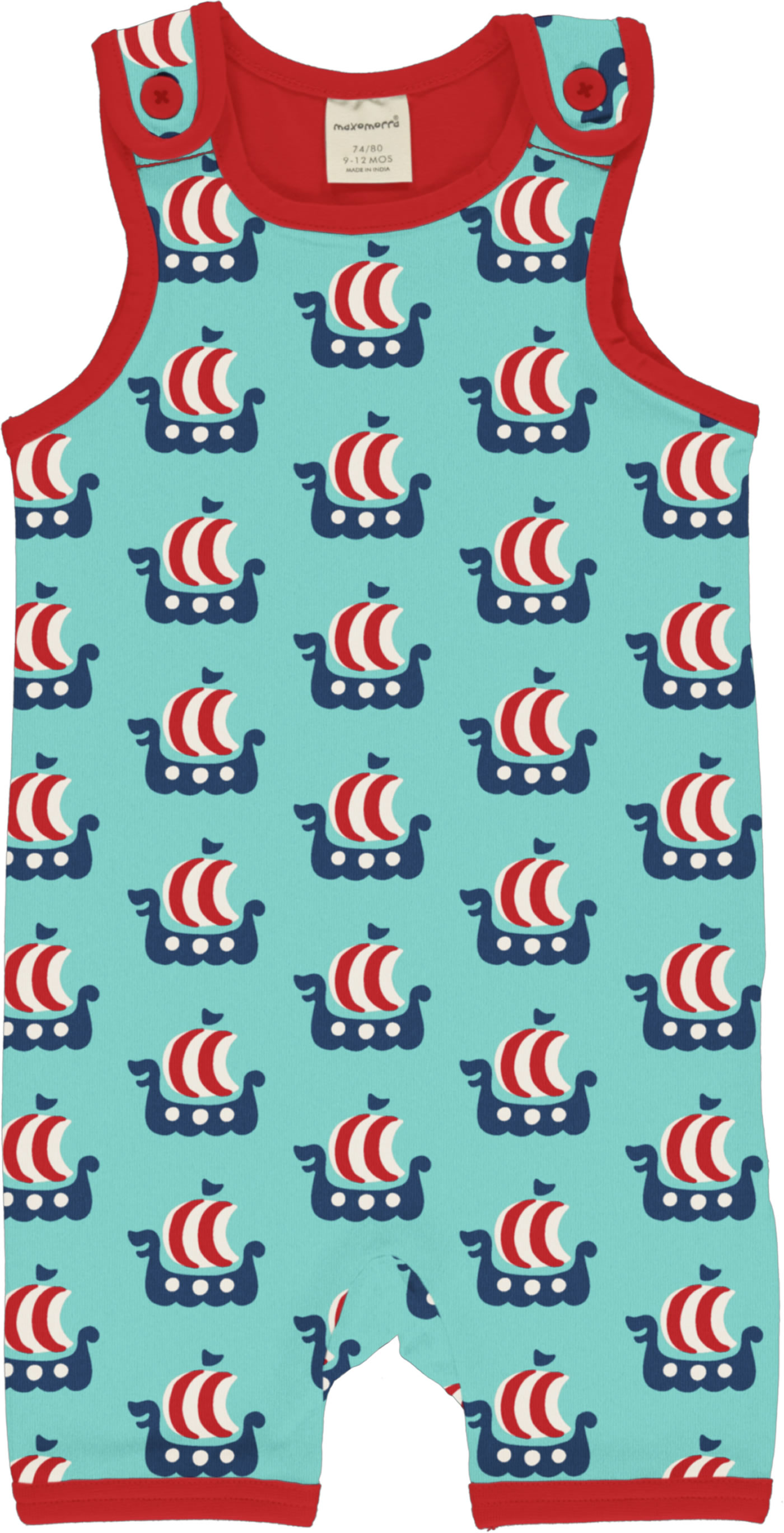 Toller Spieler in blau und rot mit kurzen Beinen und mit Wikingerschiff-Motiv von MAXOMORRA. Die Knöpfe an den Trägern machen das An- und Ausziehen zu einem Kinderspiel. Das weiche Material bietet einen hohen Tragekomfort.