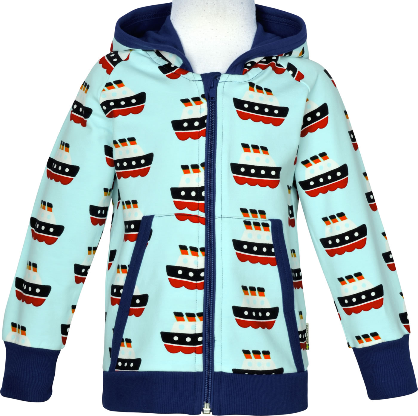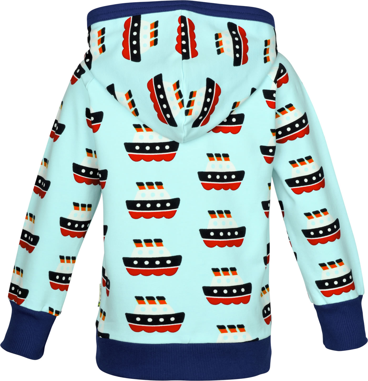 Sweat-Jacke aus weichem Baumwolljersey in blau von MAXOMORRA. Das Fähren-Motiv ist der absolute Blickfang. Die gefütterte Kapuze sowie die abgesetzten Bündchen sind schöne Details. Bauchtaschen auf der Vorderseite bieten Platz für Kleinigkeiten. Das Material aus biologischer Baumwolle und der lockere Schnitt sorgen für einen hohen Tragekomfort.