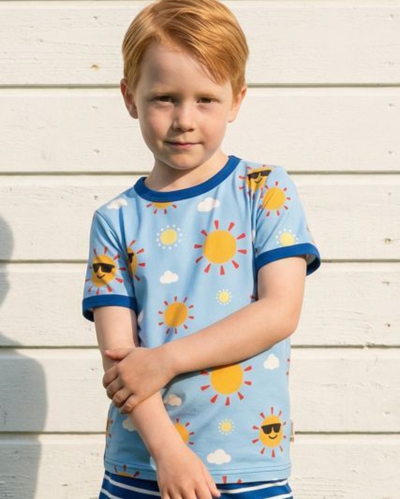 Es hat einen Rundhalsausschnitt, eine normale Passform und begeistert mit den Sonnen und Wolken rundum. ⛅