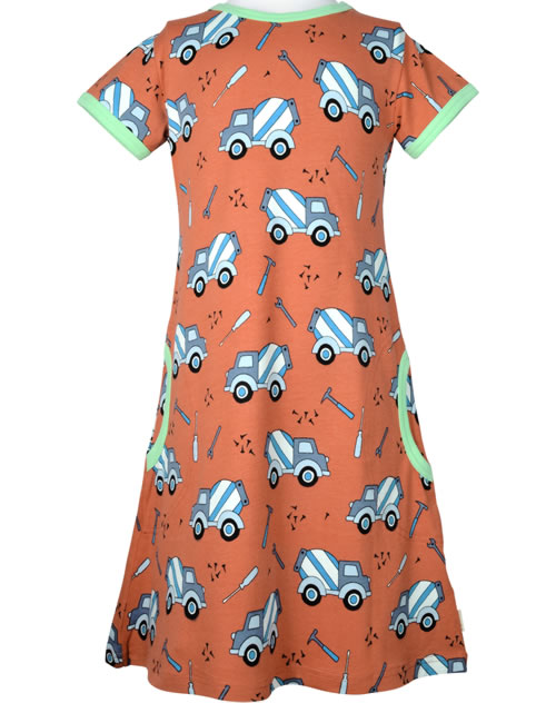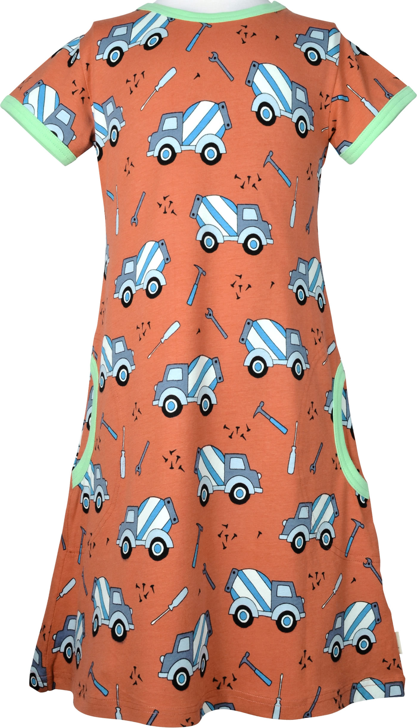 Schönes Kurzarm-Kleid in A-Linie, mit seitlichen Taschen und tollem Zement Truck-Motiv von MEYADEY. Die bunten Farben und das peppige Design machen dieses Kleid zu einem tollen Blickfang. Ein tolles Detail sind in Kontrast-Farben abgesetzte Bündchen. Das weiche Material sorgt für einen angenehmen Tragekomfort. Ab Größe 98/104 ohne Druckknöpfe am Halsausschnitt.