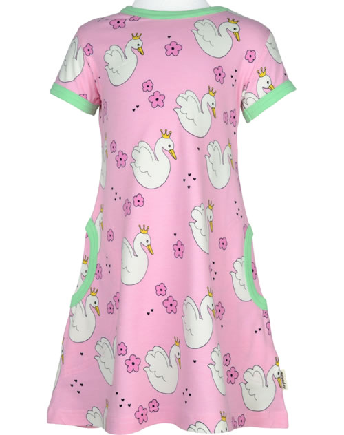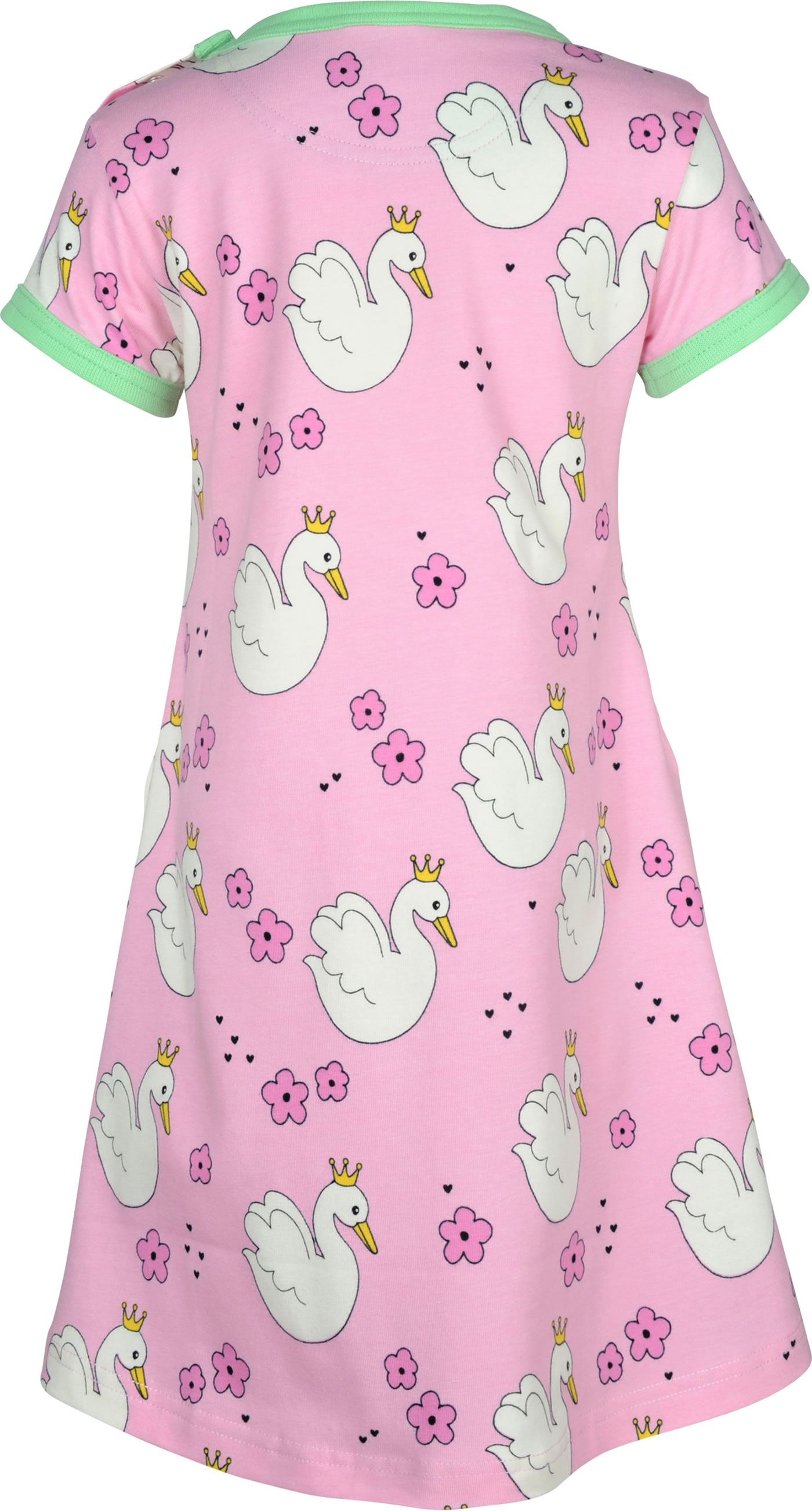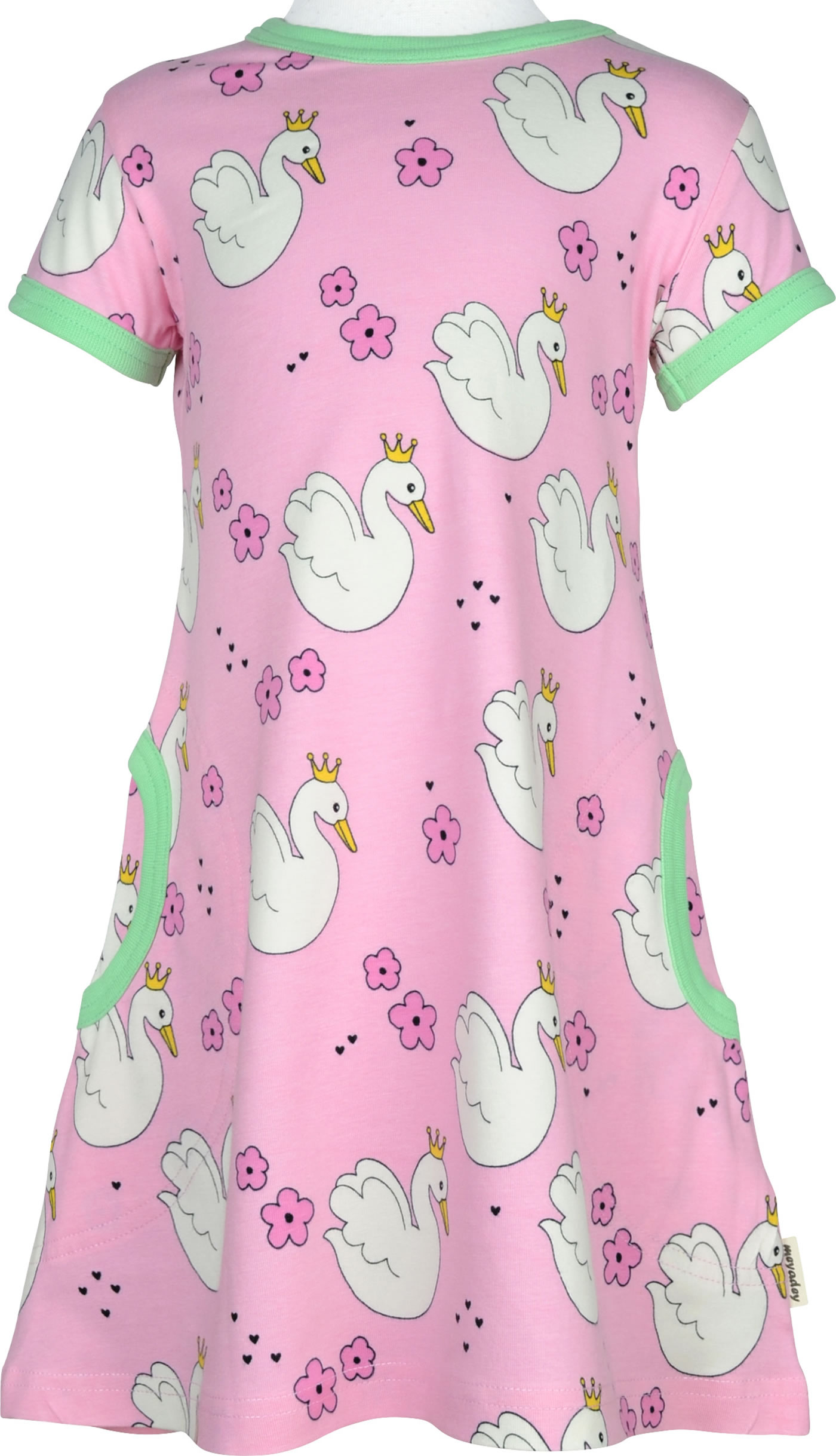Schönes Kurzarm-Kleid in A-Linie, mit seitlichen Taschen und hübschem Schwanen-Motiv von MEYADEY. Die bunten Farben und das peppige Design machen dieses Kleid zu einem tollen Blickfang. Ein tolles Detail sind in Kontrast-Farben abgesetzte Bündchen. Das weiche Material sorgt für einen angenehmen Tragekomfort. Ab Größe 98/104 ohne Druckknöpfe am Halsausschnitt.