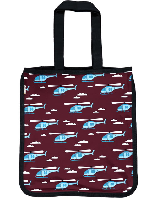 Hübsche Tragetasche in bordeaux aus weichem Jersey-Material mit Helikopter-Motiven von MEYADEY. Die unifarbene Innenseite ist ein schöner Kontrast zu dem farbenfrohen Beutel.